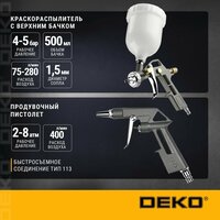 Набор пневмоинструмента DEKO DKSG05 предназначен для лакокрасочных работ, продувки загрязненных поверхностей сжатым воздухом, подкачки шин, нагнетания технических растворов и вязких жидкостей. Корпуса изготовлены из металла, что позволяет добиться высокой надежности и длительного срока службы. Также стоит отметить большой рабочий ресурс и возможность длительной работы без остановки.
