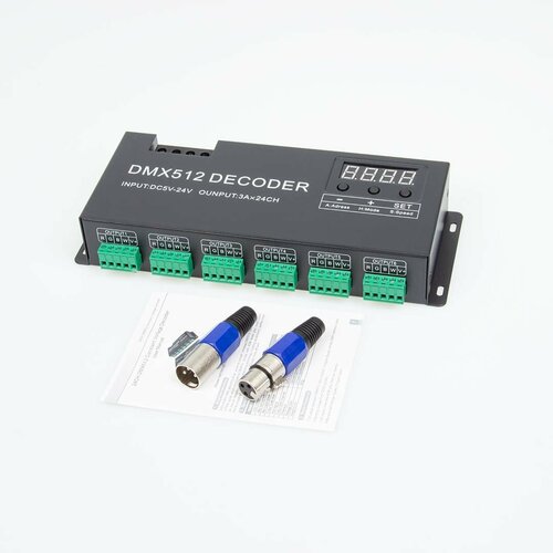 Декодер DMX 512 с цифровым дисплеем, для управления светодиодной лентой. Имеет вход и выход DMX512. 24 канала (разбиты на 6 групп по 4 канала RGBW), напряжение питания 5-12-24V, максимальный выходной ток до 3A на канал, мощность 360W (5V), 864-1728W (12/24V). Размеры 250x105x43мм. Размеры упаковки 270х115х55мм. Вес 880г.