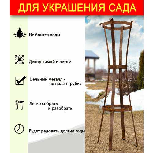 Особенностью данной опоры / шпалеры / для растений является ее дизайн. Окрас в виде естественной патины (ржавления) придает ей натуральный и естественный вид, который не влияет на прочностные свойства конструкции, а лишь подчеркивает природную красоту опоры.