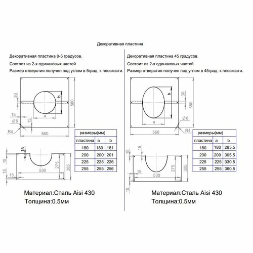 Декоративная пластина имеет угол 35-45°, что позволяет легко и быстро установить ее на крыше. Диаметр внутренний составляет 200 мм, а внешний - также 200 мм. Это гарантирует точное совпадение с диаметром трубы дымохода, что обеспечивает надежную фиксацию и исключает возможность протечек.