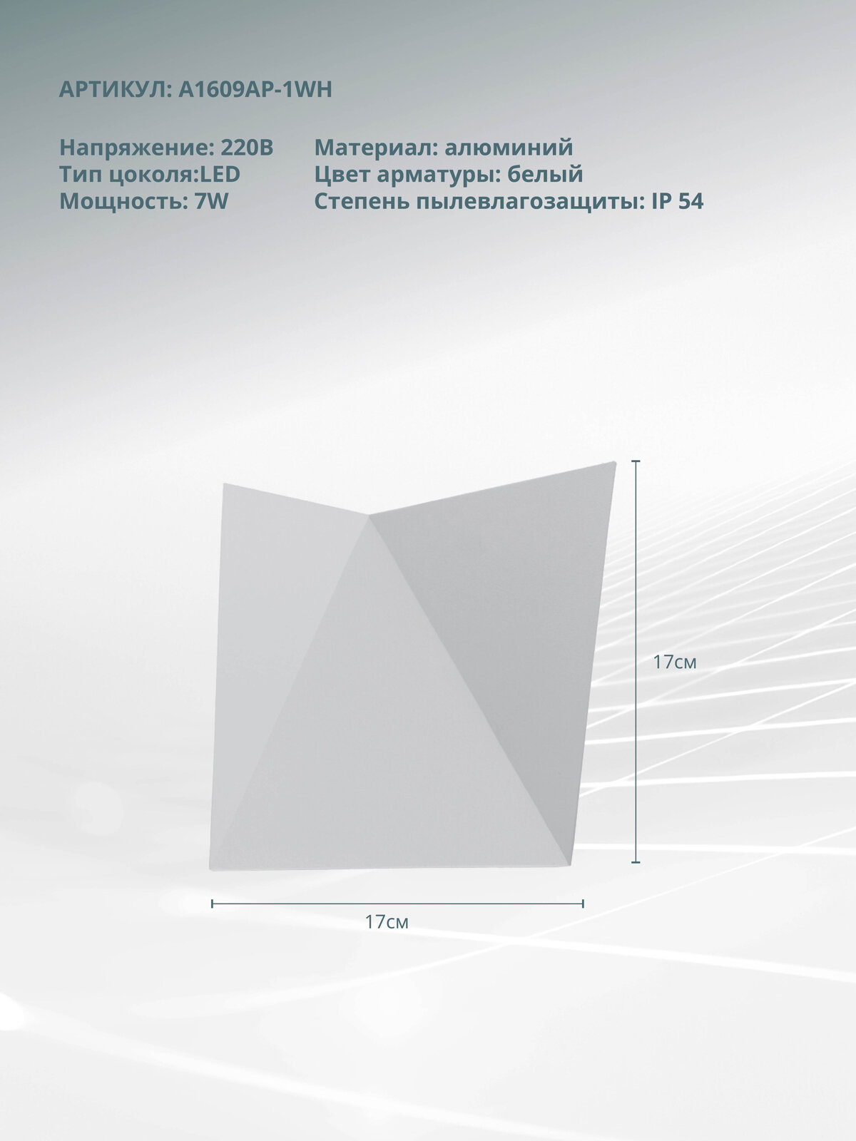 Описание: Arte Lamp A1609AP-1WH - настенный светильник в стиле модерн. Он подчеркнет ваш стиль и создаст уютную атмосферу в комнате. Размер светильника составляет 8х17х17 см, вес - 0,5 кг. Материал плафона - металл белого цвета, материал арматуры - алюминий. Внутри установлены светодиодные лампы. Площадь освещения - 2 квадратных метра.