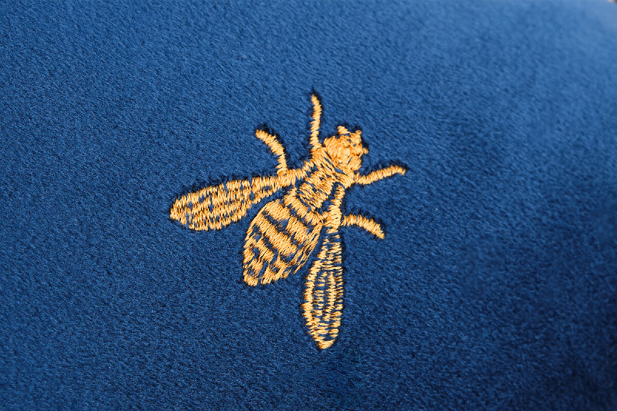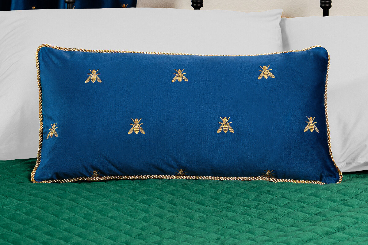 Декоративная односторонняя подушка из полиэстера синего цвета 30х60 см. с контрастным кантом и вышитыми золотыми пчелами. В основе паттерна – вышитая золотая пчела. В разных культурах это символ бессмертия, трудолюбия, мудрости и даже символ геральдики. Вышивка золотыми нитями в сочетании с бархатными текстурами и насыщенной цветовой гаммой производит wow-эффект. Zolotoy Roy придаст интерьеру утончённое благородство и наполнит его атмосферой торжества. Бархатная поверхность приятна на ощупь. Съёмный чехол на потайной молнии легко чистить и стирать. Плотный наполнитель хорошо держит форму, благодаря чему изделие не проминается и не деформируется.
