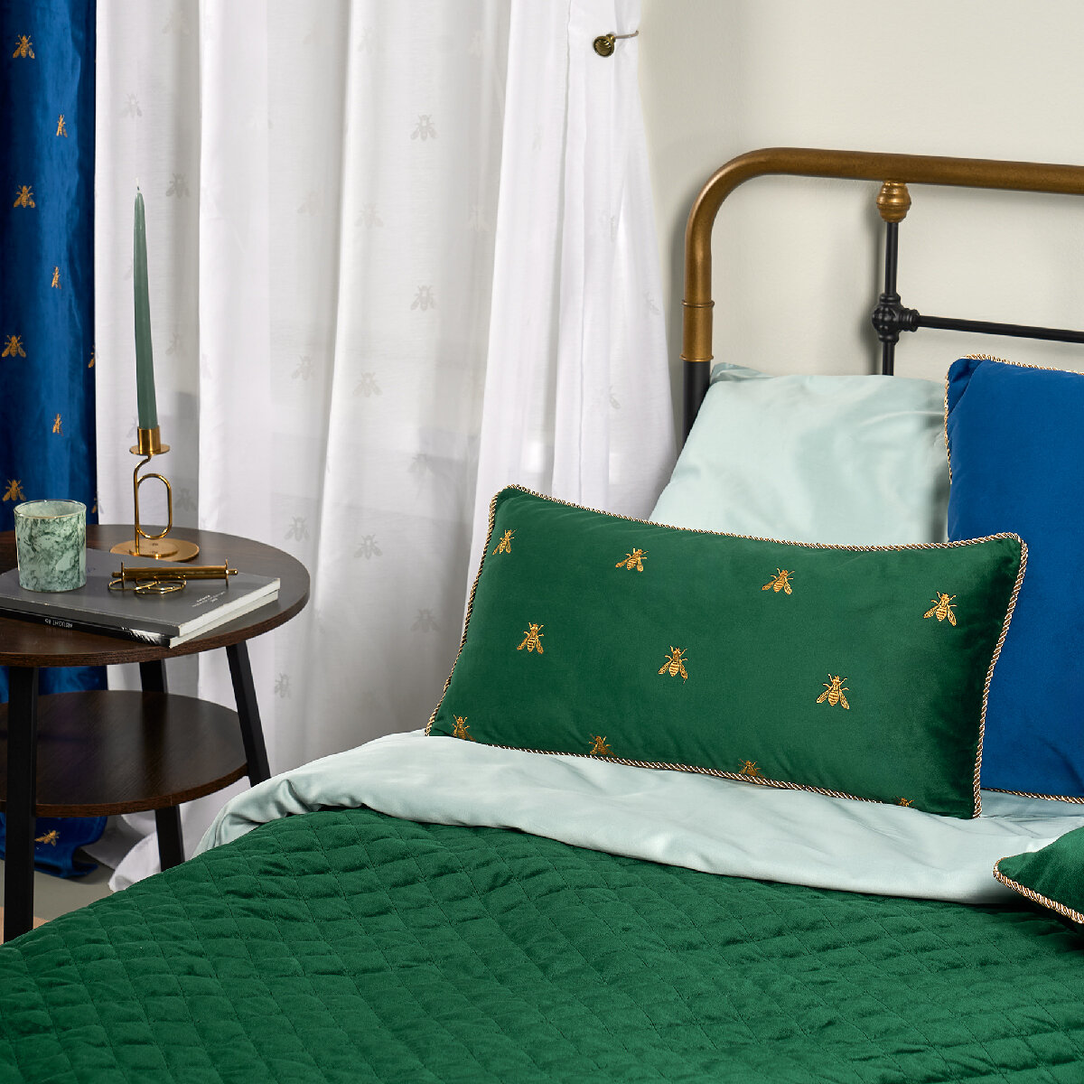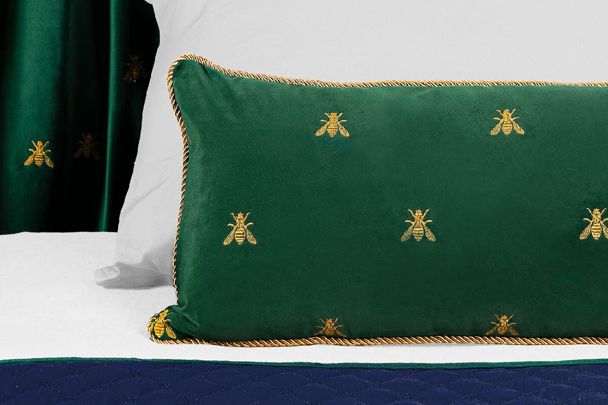 Декоративная односторонняя подушка из полиэстера зеленого цвета 30х60 см. с контрастным кантом и вышитыми золотыми пчелами. В основе паттерна – вышитая золотая пчела. В разных культурах это символ бессмертия, трудолюбия, мудрости и даже символ геральдики. Вышивка золотыми нитями в сочетании с бархатными текстурами и насыщенной цветовой гаммой производит wow-эффект. Zolotoy Roy придаст интерьеру утончённое благородство и наполнит его атмосферой торжества. Бархатная поверхность приятна на ощупь. Съёмный чехол на потайной молнии легко чистить и стирать. Плотный наполнитель хорошо держит форму, благодаря чему изделие не проминается и не деформируется.