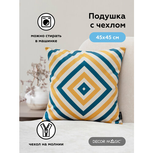 Декоративная подушка DECOR MAGIC со съемным чехлом размером 45х45 см на молнии изготовлена из безопасного гипоаллергенного материала. Внутреннее наполнение - вспененное 100% полиэфирное волокно. В комплектацию входит: съемный декоративный чехол и внутренняя подушка. Декоративная подушка с чехлом на молнии выглядит эстетично, т. к. внутренняя подушка не сбивается и не вылезает. А также это еще и очень удобно, потому что чехол можно просто снять и постирать, выбрав деликатный режим на стиральной машине , температура не более 30 градусов, 600 оборотов. Температура глажения не более 110 С с изнаночной стороны. Подушки DÉCOR MAGIC сделают дизайн комнаты более ярким, индивидуальным и уютным, они незаменимы в поддержании единого стилевого образа. С нами быстро, легко, красиво! Внимание: Технологически допустимые отклонения от заявленного размера +/- 3%, согласно ГОСТ Р 51554-99. Цвет товара может не совпадать с представленным на фото в связи с индивидуальными настройками цветов монитора и его яркости, а так же цвет изделий в одном дизайне, может не совпадать из-за разности фактур.