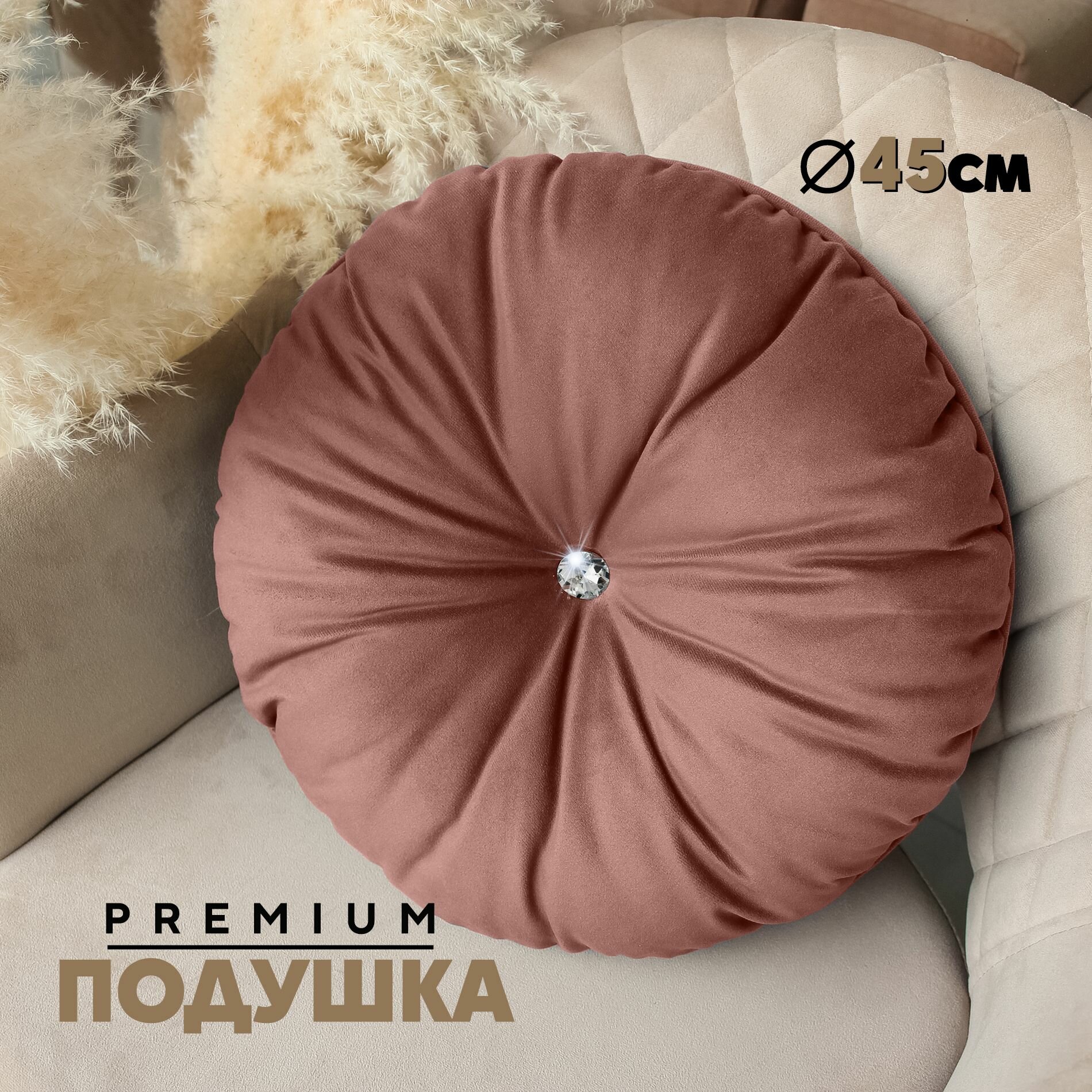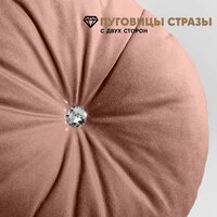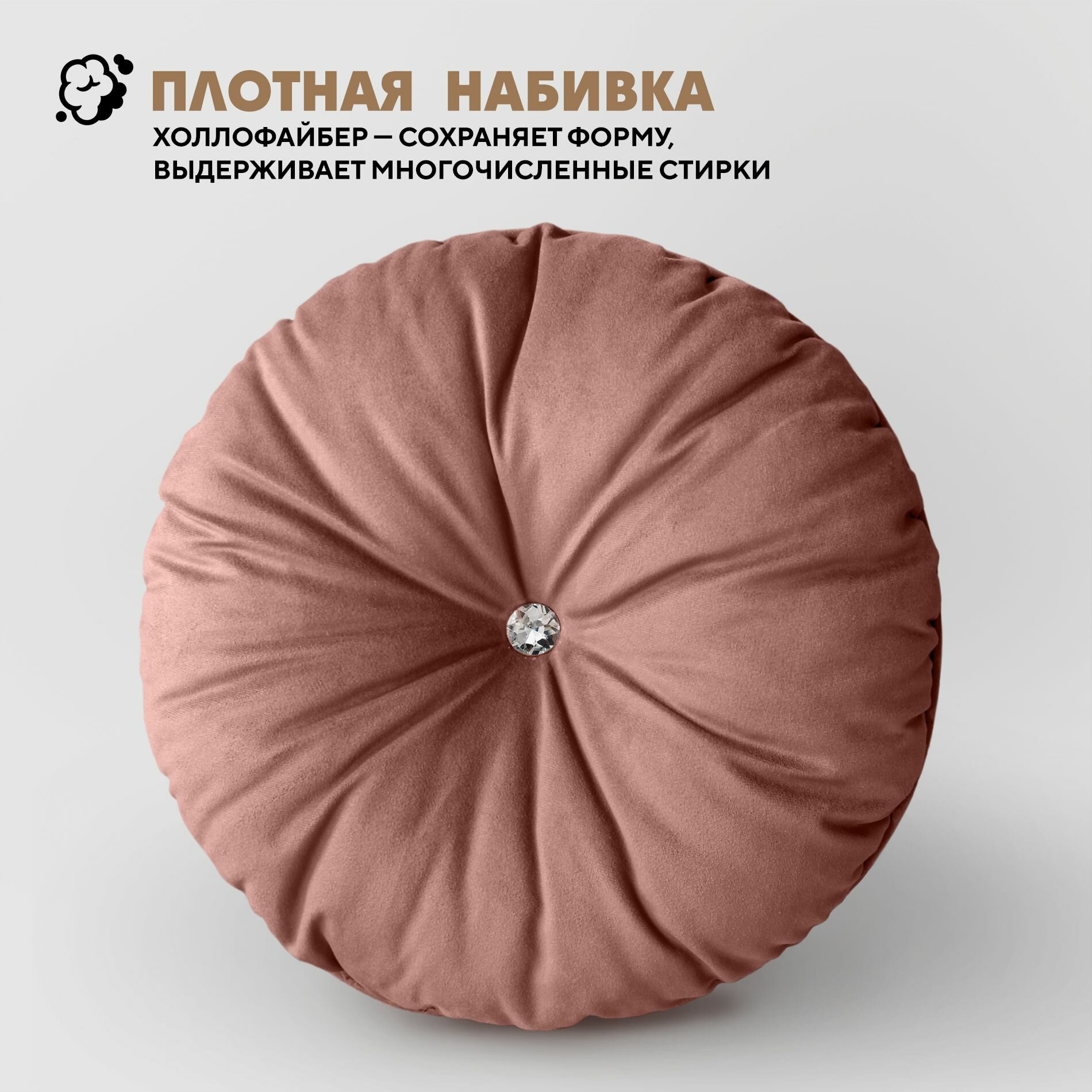 Диаметр подушки: 45см. Наполнитель подушки: гипоаллергенный холофайбер (быстро сохнет и не скатывается со временем при надлежащем уходе). Пуговицы - стразы с двух сторон круглой подушки. Чехол несъемный.