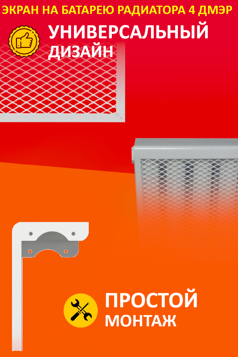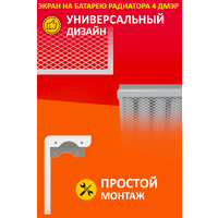 соответствует стандартной ширине 4 секций радиатора отопления; изготовлен из стали толщиной 0,7 мм с наполнением цельнометаллической просечно-вытяжной сеткой; размер ячейки – 13х25х3мм; возможно соединение экранов для монтажа на радиатор нестандартного размера (предусмотрены соединительные отверстия ⌀8мм)
