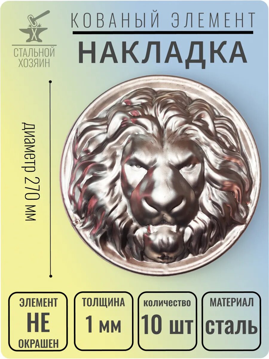 Накладка стальная голова льва имеет диаметр 270 мм. Материал изготовления: сталь, толщина 1 мм. Товар поставляется комплектами по 1, 3, 5 и 10 штук.