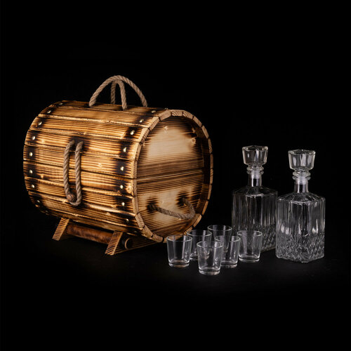 Подарочный мини-бар из дерева – это презентабельное изделие и оригинальный подарок, который можно преподнести на любой праздничный повод. Деревянный мини-бар станет статусным презентом для семейной пары или мужчины (друга, папы, мужа, начальника, бизнес-партнера). Он сделан без изъянов и недочетов. Ведь в ходе его производства мастера контролируют каждый процесс, начиная от разработки эскиза будущего мини-бара, до его воплощения в реальность. Мини-бар изготовлен из экологически чистой сосны. Каждая дощечка из натуральной древесины пропитана льняным маслом и подвержена обработкой методом обжига. Деревянная бочка вручную покрыта морилкой, что эффектно подчеркивает благородную структуру дерева. Под массивной крышкой бара располагаются отделения для 6 стопок, который входят в комплект, а также устойчивая подставка для хранения двух бутылок. Деревянный мини-бар - не только практичный аксессуар, но и стильный элемент декора, который органично впишется в интерьер дома, офиса и загородного домика. *Дизайн стопок и графинов на фото может отличаться в зависимости от партии поставщика, все прочие характеристики предметов идентичны