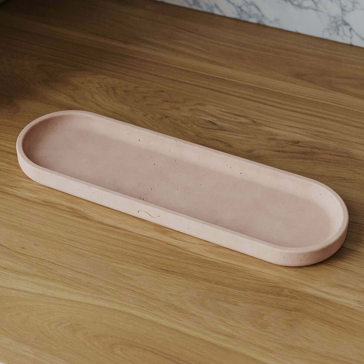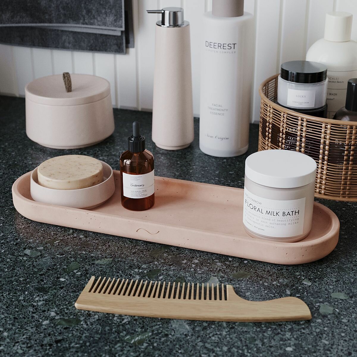 Подставка для ванной комнаты для косметики и аксессуаров из коллекции Astrid от MUSKO HOME - это универсальный декоративный поднос, изготовленный вручную из особо прочного бетона. Изделие обработано водоотталкивающим лаком, надёжно защищающим текстуру от воды и разводов.