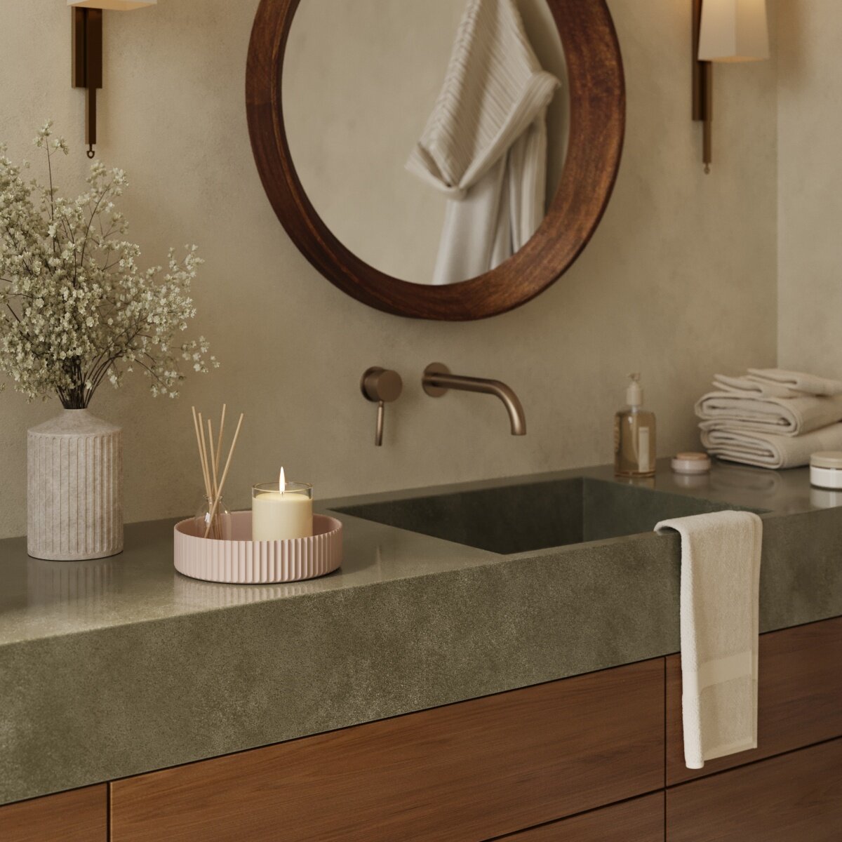 Подставка для ванной комнаты для косметики и аксессуаров из коллекции Chloe от MUSKO HOME - это универсальный декоративный поднос, изготовленный вручную из особо прочного бетона. Изделие обработано водоотталкивающим лаком, надёжно защищающим текстуру от воды и разводов.