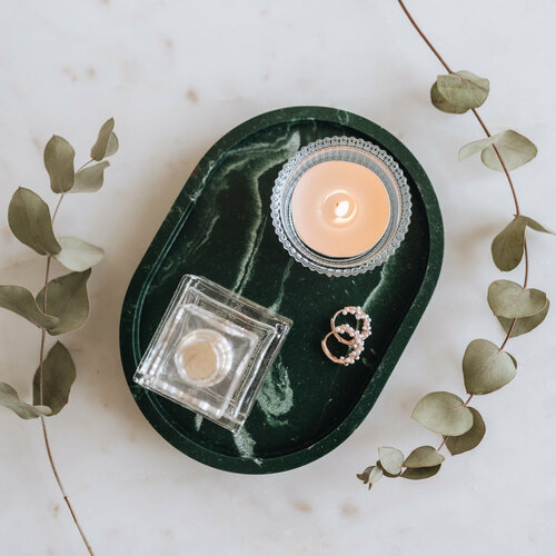 Поднос из литьевого мрамора - это прекрасный пример сочетания элегантности и функциональности. Его гладкая поверхность идеально подходит для сервировки еды/украшений/свечей/туалетных принадлежностей. Благодаря выполнению из литьевого мрамора, каждый поднос имеет свой уникальный рисунок и текстуру и обладает прочностью, которая обеспечивает долговечность использования ведь он не подвержен коррозии и легко моется, что делает его идеальным выбором для использования в любой обстановке. Эргономичная форма позволяет легко переносить поднос из одного места в другое, а его уникальный дизайн привлекает внимание и создает неповторимую атмосферу. Поднос из литьевого мрамора - это не только практичный аксессуар для вашего дома, но и изысканное украшение вашего интерьера. Он станет прекрасным подарком для тех, кто ценит качество и эстетику в своей жизни. Длина: 16 см Ширина: 11 см Толщина бортов 0.5 см.