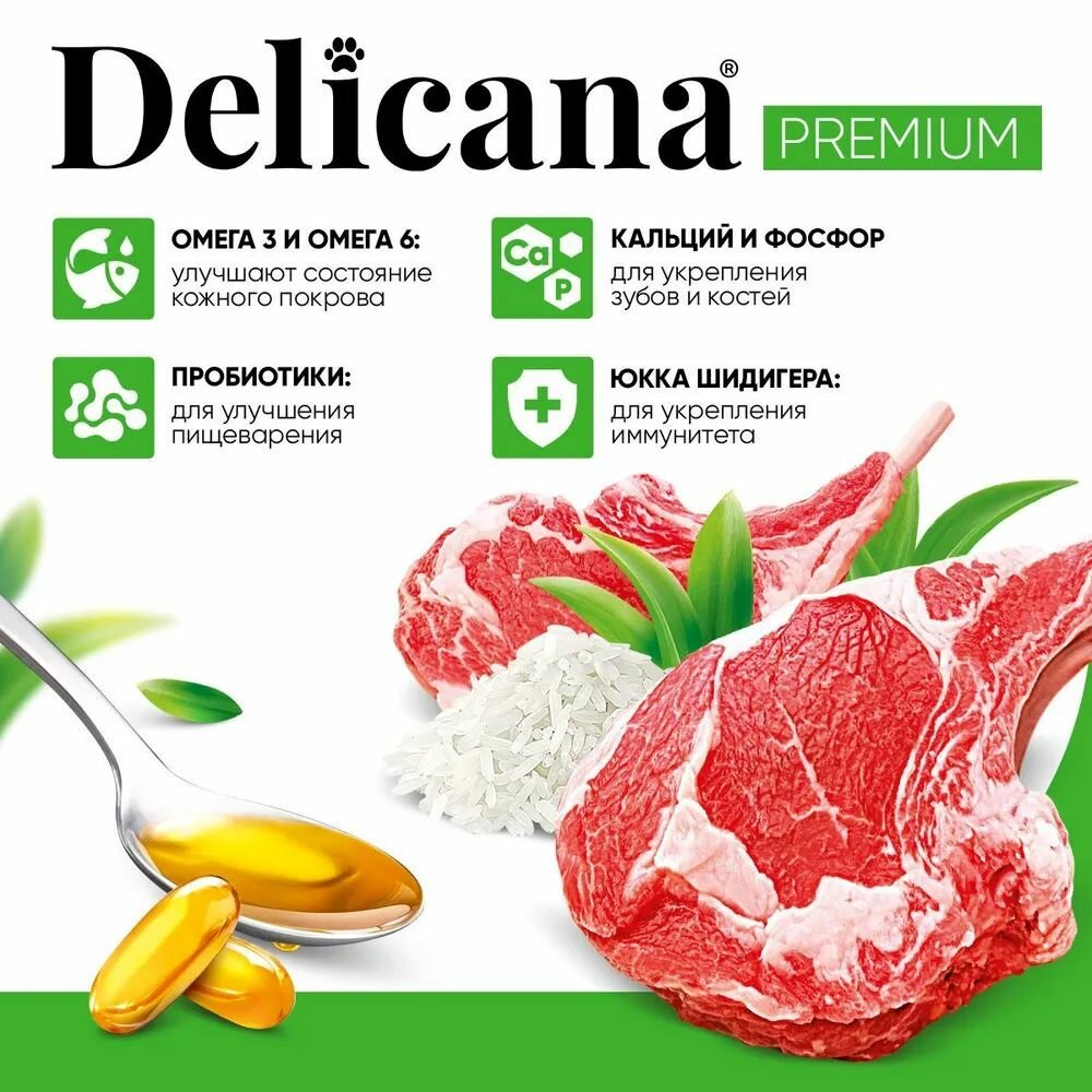Полнорационный натуральный сухой корм Delicana с ягненком и рисом. Способствует поддержанию иммунитета и укреплению организма животного, поддерживает здоровье суставов с помощью глюкозамина и хондроитина, содержит сбалансированные минералы для здоровья сердца и почек.