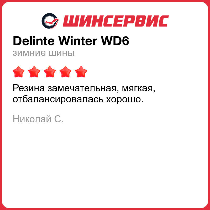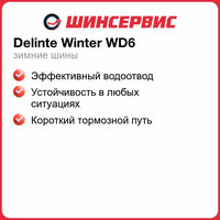 Минимальное количество в заказе - 4 штуки. Шины известного бренда Delinte марки Winter WD6 отлично зарекомендовали себя в зимнюю погоду. Эти шины не оснащены технологий Ранфлет (Runflat). Более подробную информацию вы можете получить на сайте производителя.