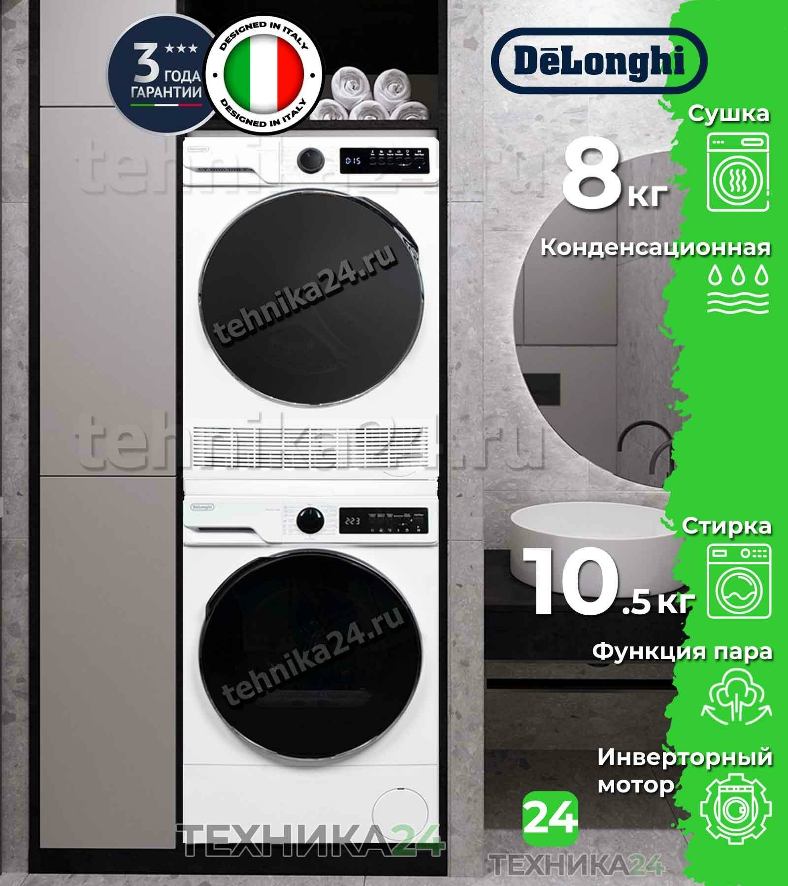 Купить DeLonghi комплект для установки в колонну Стиральная машина DWM 1135 VI ALICIA + Сушильная машина DTD 8105 C FABIO + Соединительный кит с доставкой по всей России.