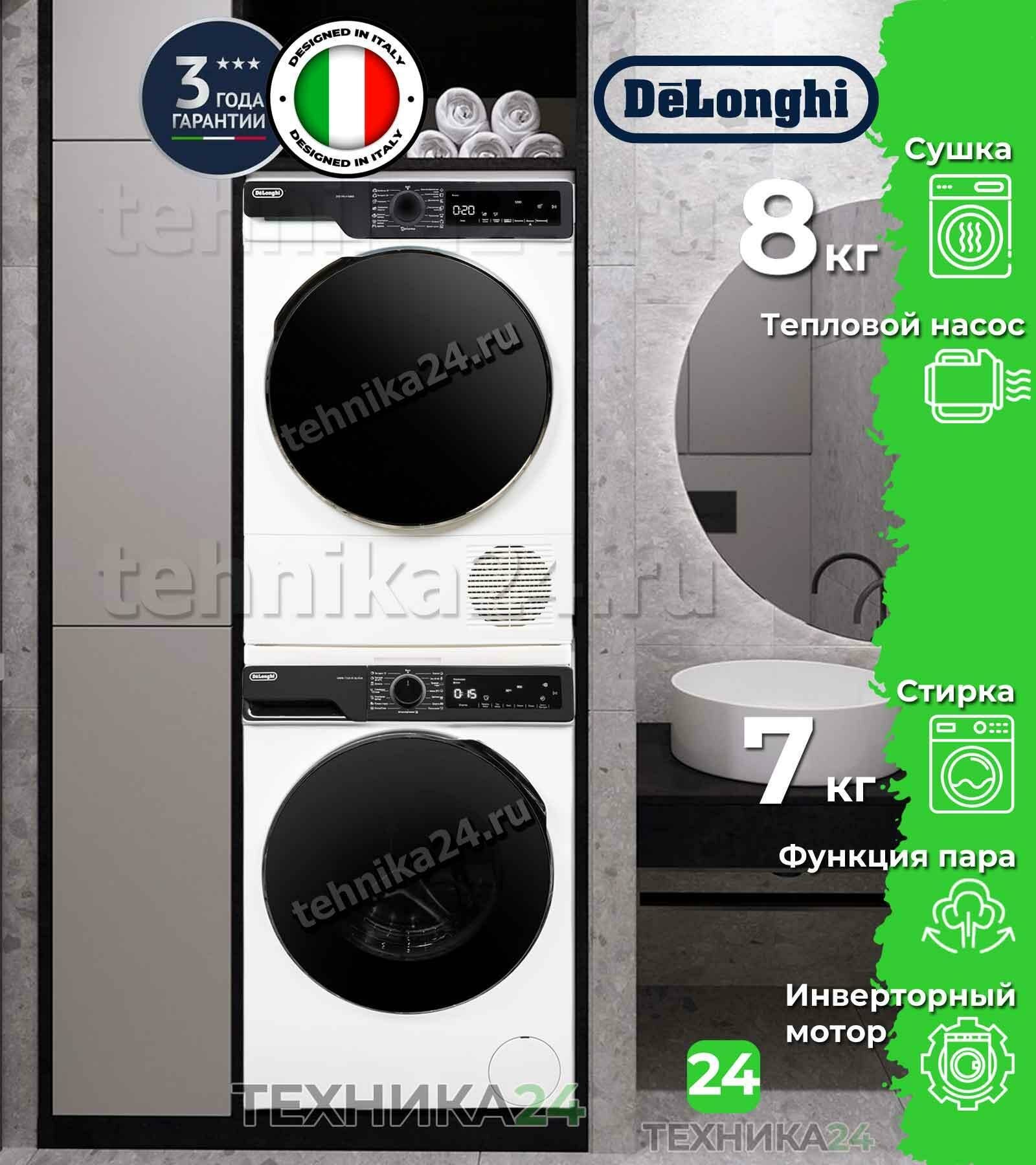 DeLonghi комплект для установки в колонну Стиральная машина DWM 724 VI ALICIA + Сушильная машина с тепловым насосом DTD 8105 H FABIO + Соединительный кит: сравнение цен, характеристики, фото, актуальное наличие и цены.