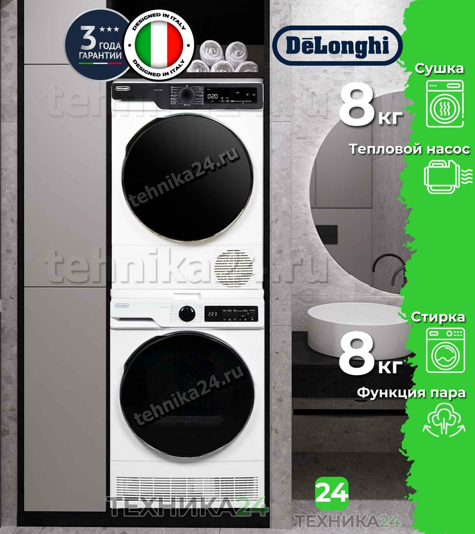Купить DeLonghi комплект для установки в колонну Стиральная машина DWM 825 V ALICIA + Сушильная машина с тепловым насосом DTD 8105 H FABIO + Соединительный кит с доставкой по всей России.