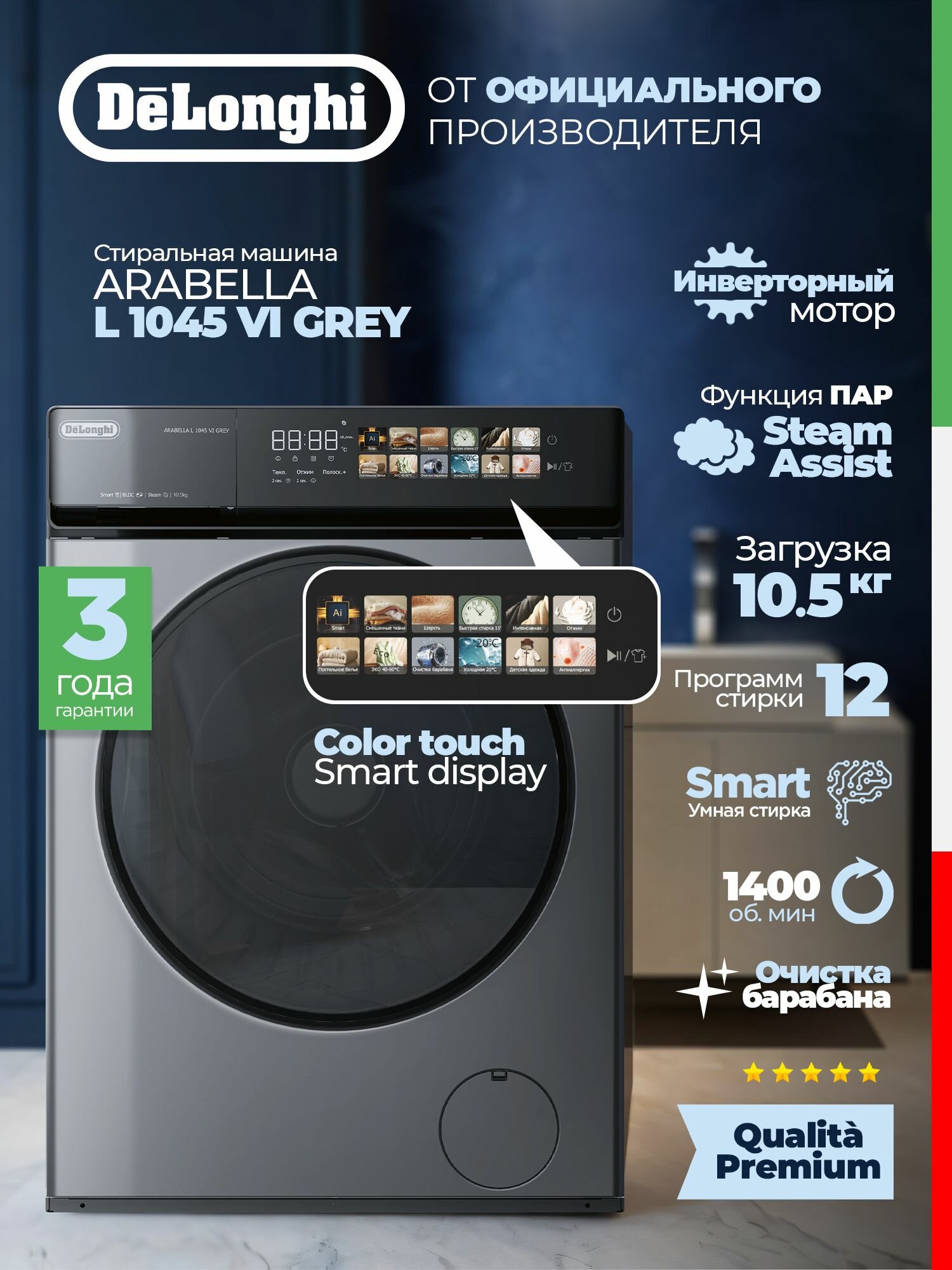 DeLonghi Стиральная машина ARABELLA L 1045 VI GREY 10,5 кг, Сенсорная, Цветная, Инвертор и Пар, Модель 2025 г, A+++: сравнение цен, характеристики, фото, актуальное наличие и цены.