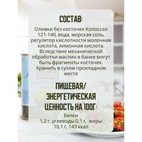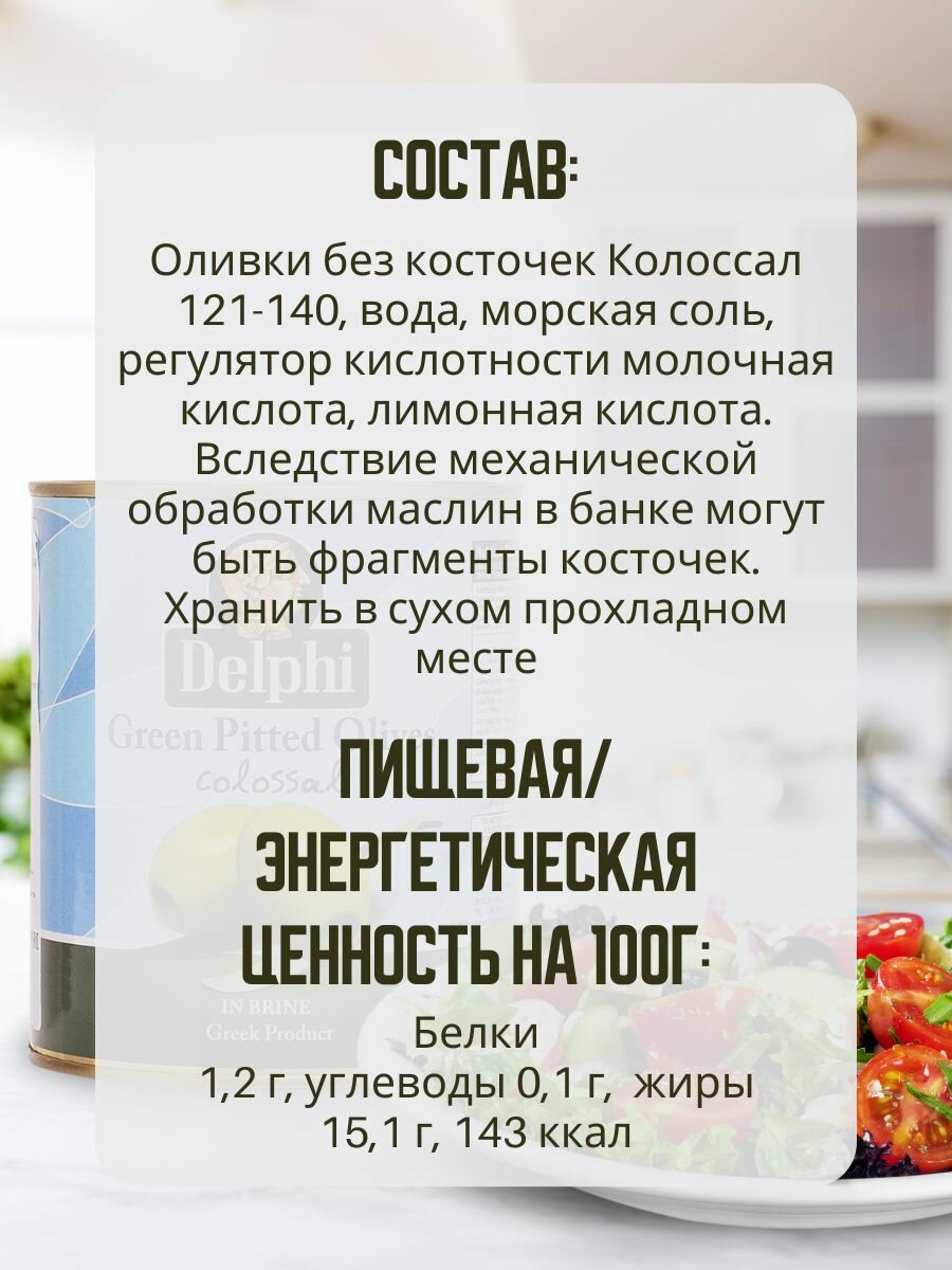 | Состав | оливки без косточек Колоссал 121-140 (46,4%), вода, морская соль, регулятор кислотности молочная кислота, лимонная кислота |