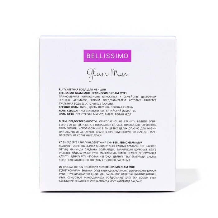 Туалетная вода Bellissimo Glam Mur (Экла д'Арпеж) относится к цветочно-фруктовой группе ароматов. Верхние ноты включают сирень и сицилийский лимон, ноты сердца - вистерию, османтус, персик, пион и чайный лист, а базовые ноты - амбру, белый кедр и мускус.