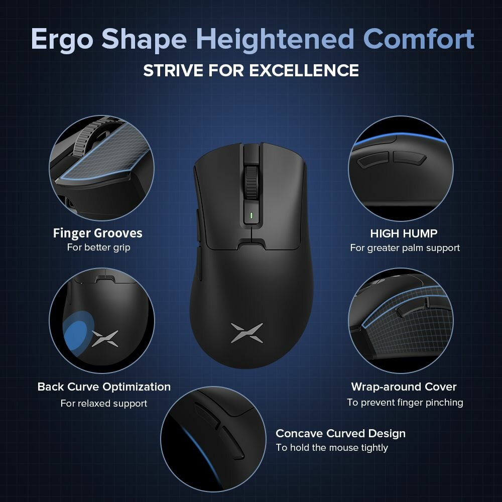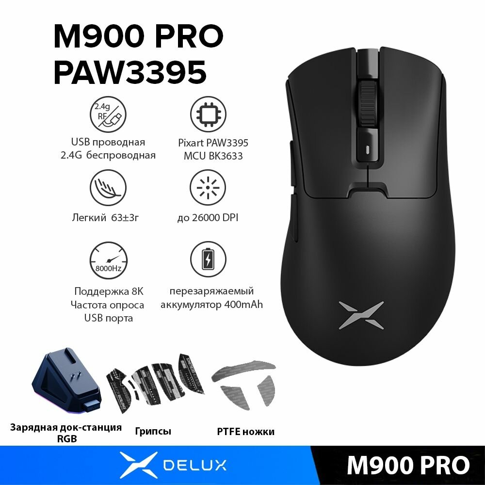 | Комплектация | 1 x Мышь M900PRO PAW3395 1 x 2.4gHz USB Приемник 1 x тефлоновые ножки 1 x Противоскользящий Глайды 1 x Магнитная зарядная станция 1 x паракордовый кабель длиной 1,6 м 1 x Руководство пользователя |