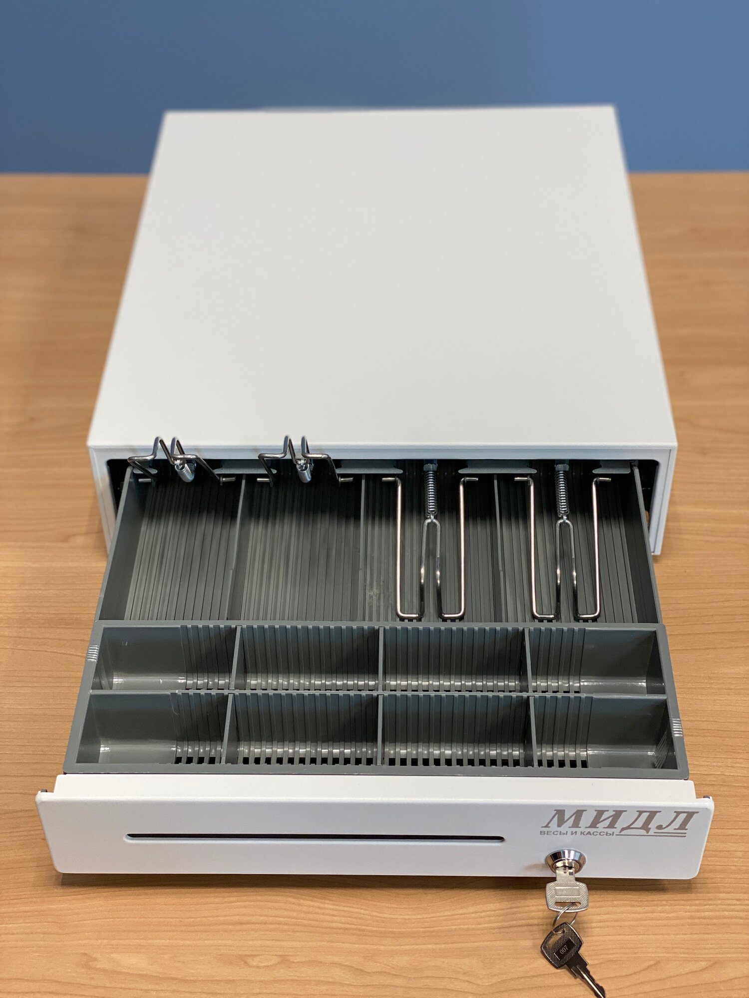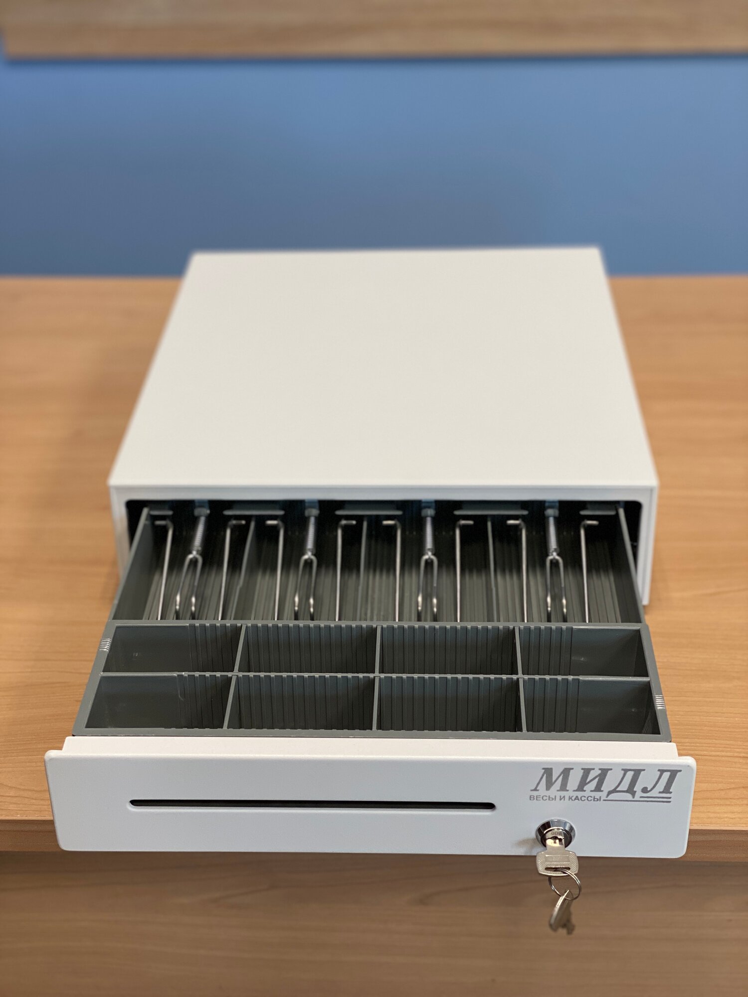 Габариты денежного ящика составляют 335х380х100 мм, что делает его компактным и удобным для размещения на рабочем месте кассира. Вес устройства составляет всего 4,5 кг, что позволяет легко перемещать его при необходимости.
