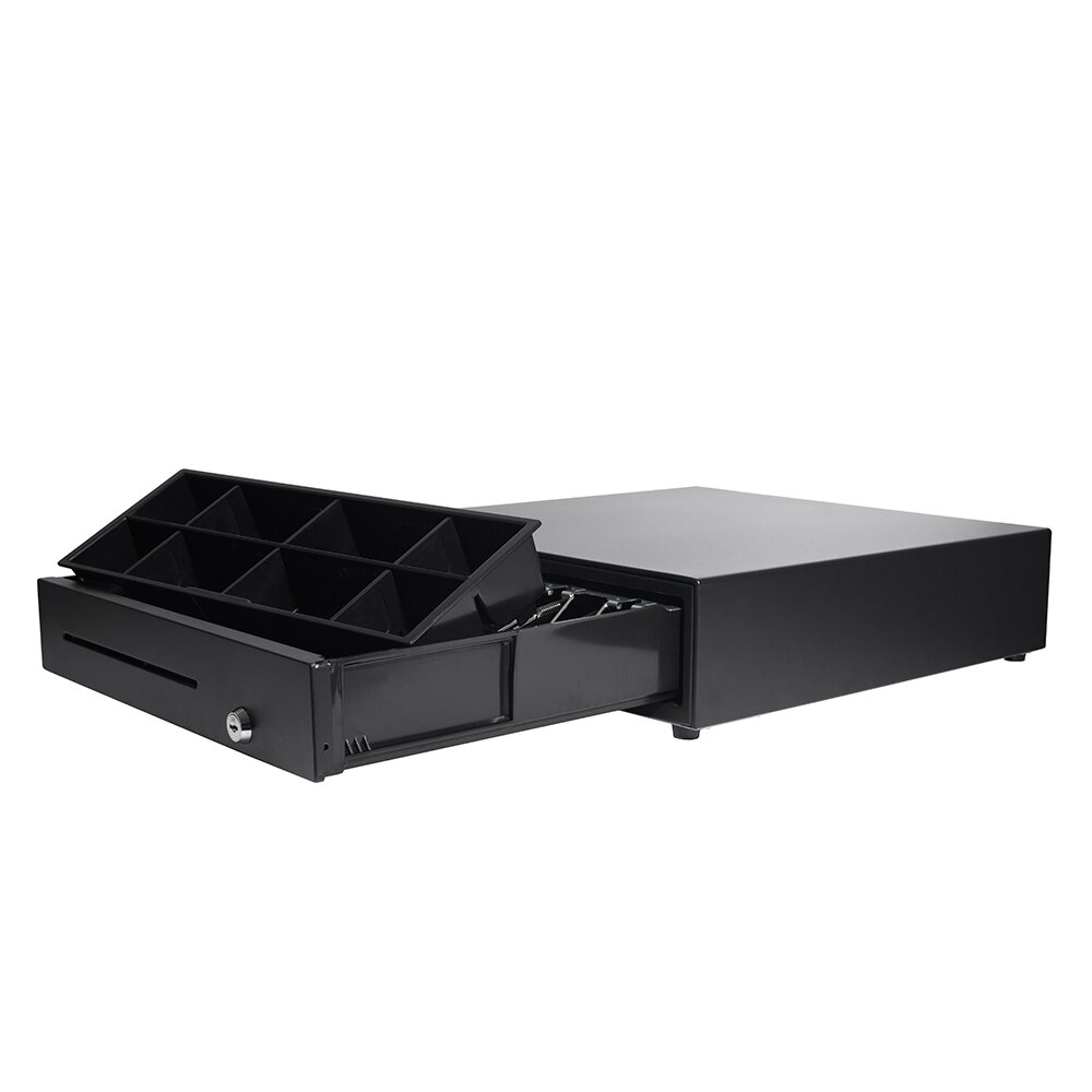Денежный ящик МойPOS MCD-405 предназначен для работы в системах массового обслуживания и торговых помещениях большой проходимости, в том числе супермаркетах, гипермаркетах и других крупных торговых точках. Денежный ящик представляет собой металлическую конструкцию, с утолщенными стенками для повышенной сохранности. Корпус ящика изготовлен из пожаробезопасных материалов. Поставляется c электромагнитным замком с различными напряжениями управления включения электромагнита, а также с управлением по интерфейсу RJ-11. Имеет 5 отделения для хранения купюр и 8 отделения для монет, одно из которых съемное, за счет чего образуется дополнительный слот для хранения купюр или чеков. Отсеки для купюр имеют пружинные лапки, фиксирующие купюры в лотке. При этом конструкция лотка для купюр позволяет кассиру не поднимать лапку при расчете. В комплекте поставляется два ключа.
