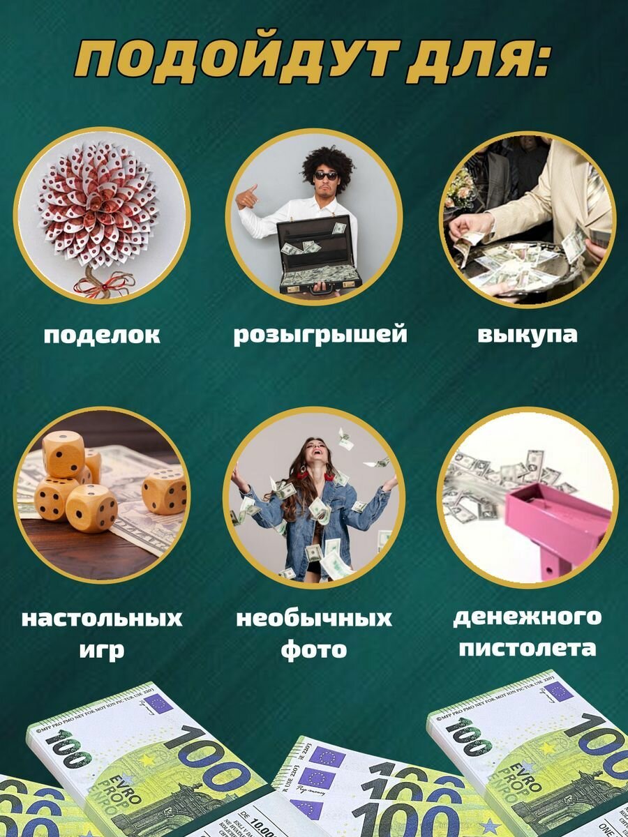 Деньги фальшивые, фейковые, сувенирные игрушечные купюры номинал 100 евро , 30 пачек: сравнение цен, характеристики, фото, актуальное наличие и цены.