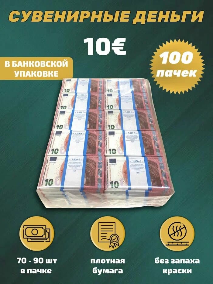 Деньги фальшивые, фейковые, сувенирные игрушечные купюры номинал номинал 10 евро, 100 пачек: сравнение цен, характеристики, фото, актуальное наличие и цены.