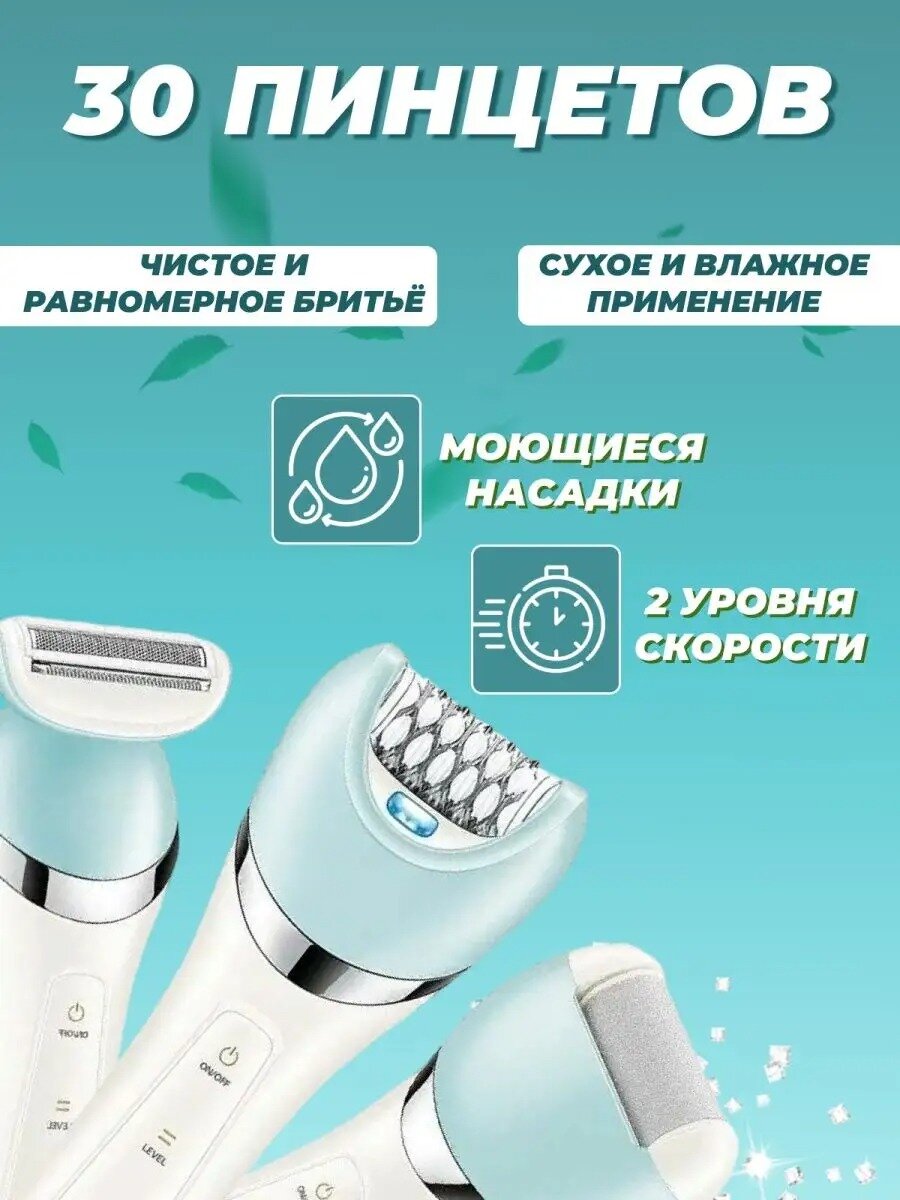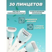 Депилятор женский 5 в 1 - это многофункциональный прибор, который сочетает в себе эпилятор, женский триммер, уход за телом и кожей, а также подходит для зоны бикини и подмышек. Прибор оснащен 30 пинцетами и двумя скоростями, что позволяет эффективно удалять волосы разной длины и жесткости. Депилятор имеет две насадки для бритья и массажа, а также насадки для пилинга лица и пяток. Это позволяет не только удалять волосы, но и ухаживать за кожей, делая ее гладкой и мягкой. В комплект депилятора входят щетка для очистки, защитная крышка и кабель USB. Это обеспечивает удобство использования и хранения прибора. Депилятор работает от сети или от собственного аккумулятора, что позволяет использовать его в любом месте и в любое время. Время работы от аккумулятора составляет 180 минут, а время заряда аккумулятора - всего 2,5 часа. Депилятор оснащен подсветкой и массажером, что делает процесс удаления волос более комфортным и приятным. Выбирая этот депилятор , вы получаете многофункциональный и удобный прибор для ухода за собой в домашних условиях.