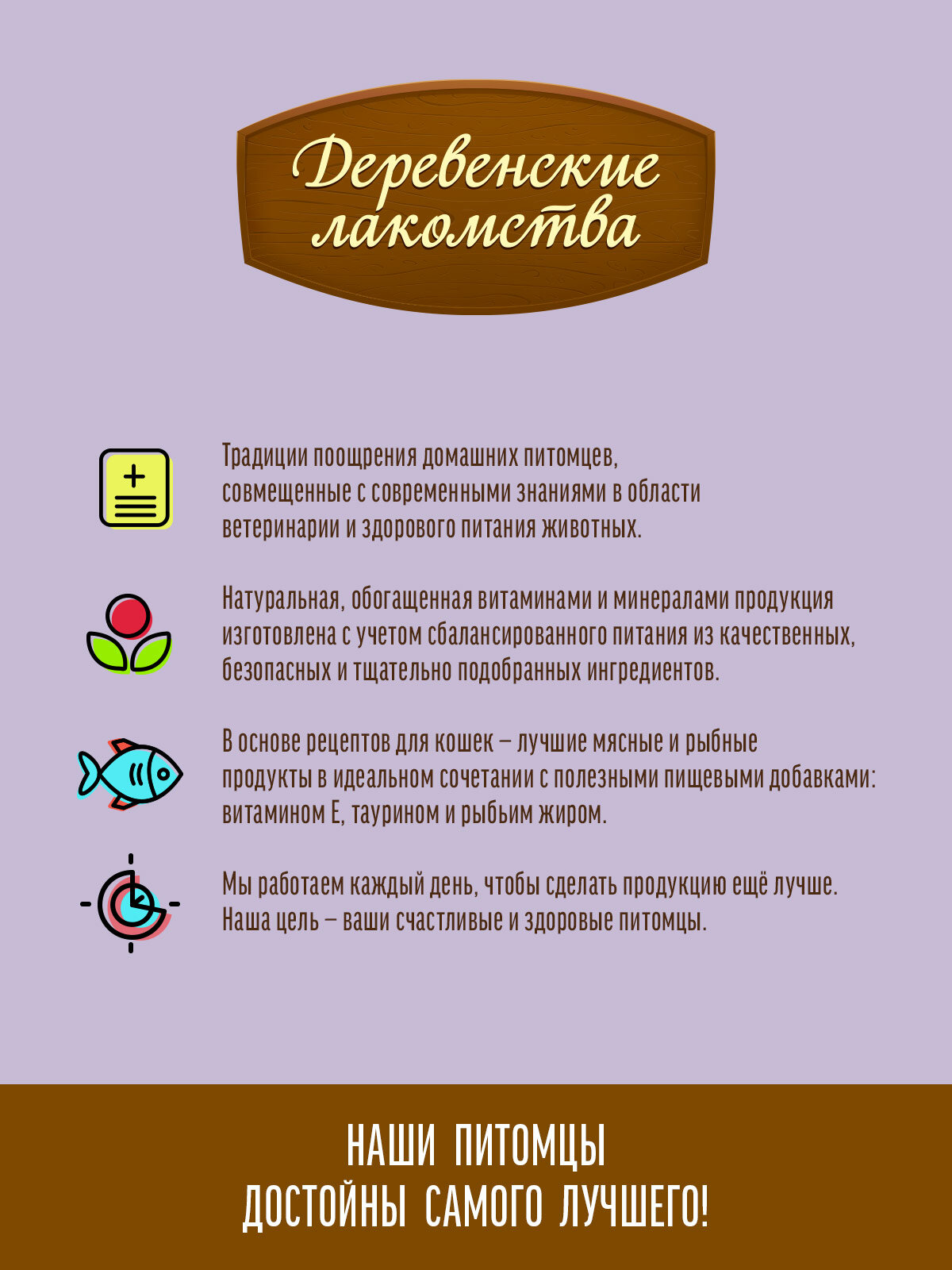 Нежнейшее пюре из лосося — изысканное угощение для самых любимых. Лакомство обогащено таурином, который не только усиливает природный вкус, но и способствует поддержанию здоровья сердца и иммунной системы. Бренд «Деревенские лакомства» предлагает натуральные корма и лакомства суперпремиум класса. Деревенские лакомства обогащены витаминами и минералами и обеспечивают сбалансированное питание ваших питомцев. Приоритет для нас — здоровье и долголетие ваших пушистых друзей. Каждый продукт изготовлен из высококачественных и безопасных ингредиентов, прошедших тщательную проверку. Мы заботимся о том, чтобы ваши любимцы получали только лучшее!