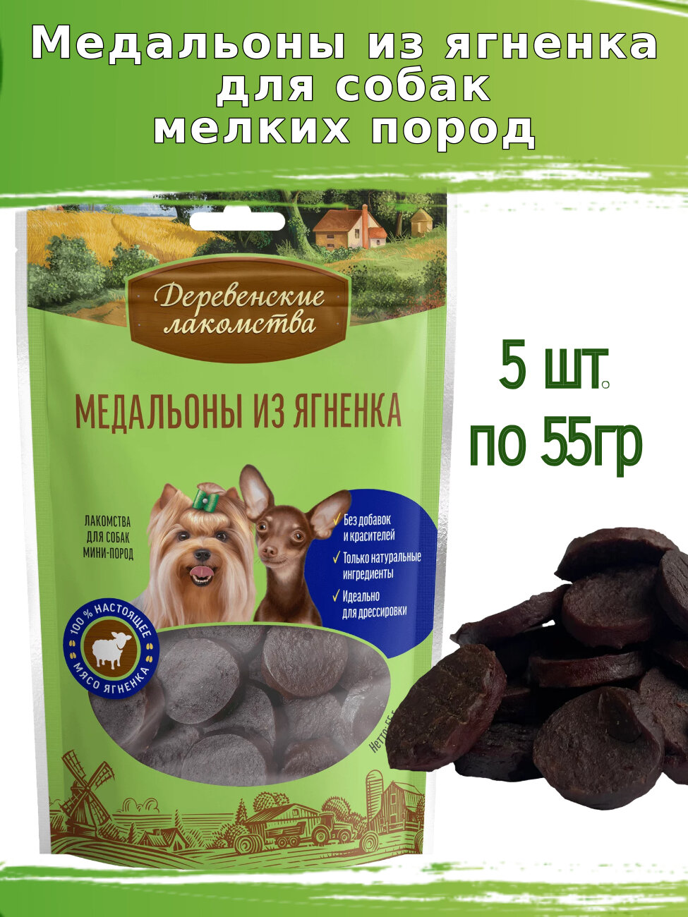 Деревенские лакомства 55г медальоны из ягненка для собак мини-пород - это вкусное, полезное и безопасное угощение для вашего питомца, которое поможет поддерживать его здоровье и активность на высоком уровне.