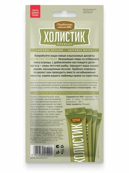 Изысканный десерт Холистик Премьер, нежнейшее пюре из отборного филе курицы с добавлением настоящего деликатеса - икры летучей рыбы. Яркий насыщенный вкус точно понравится вашей кошке, а удобная упаковка позволит вам проводить вместе незабываемые минуты. Рекомендуемая суточная норма - 10 г. Бренд «Деревенские лакомства» предлагает натуральные корма и лакомства суперпремиум класса. Деревенские лакомства обогащены витаминами и минералами и обеспечивают сбалансированное питание ваших питомцев. Приоритет для нас — здоровье и долголетие ваших пушистых друзей. Каждый продукт изготовлен из высококачественных и безопасных ингредиентов, прошедших тщательную проверку. Мы заботимся о том, чтобы ваши любимцы получали только лучшее!