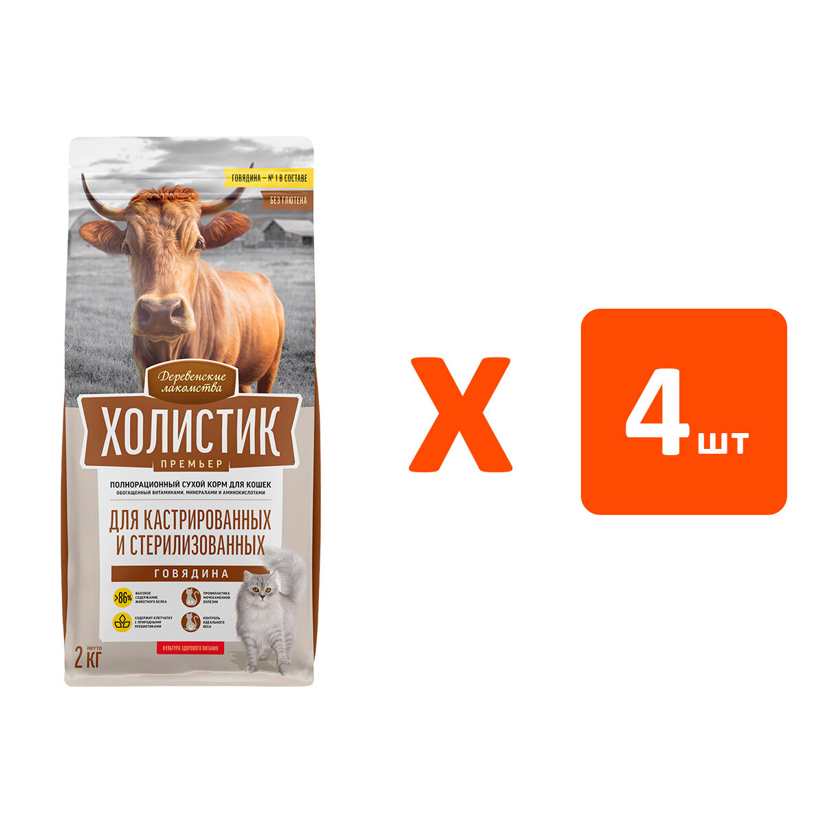 Купить Деревенские лакомства холистик премьер для взр кастр котов и стерилизованных кошек с говядиной 2 кг х 4 шт с доставкой по всей России.