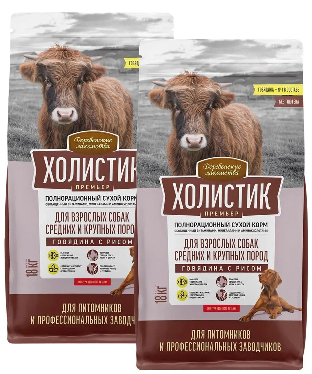 Деревенские лакомства холистик премьер для взрослых собак средних и крупных пород с говядиной и рис 18 + 18 кг: сравнение цен, характеристики, фото, актуальное наличие и цены.
