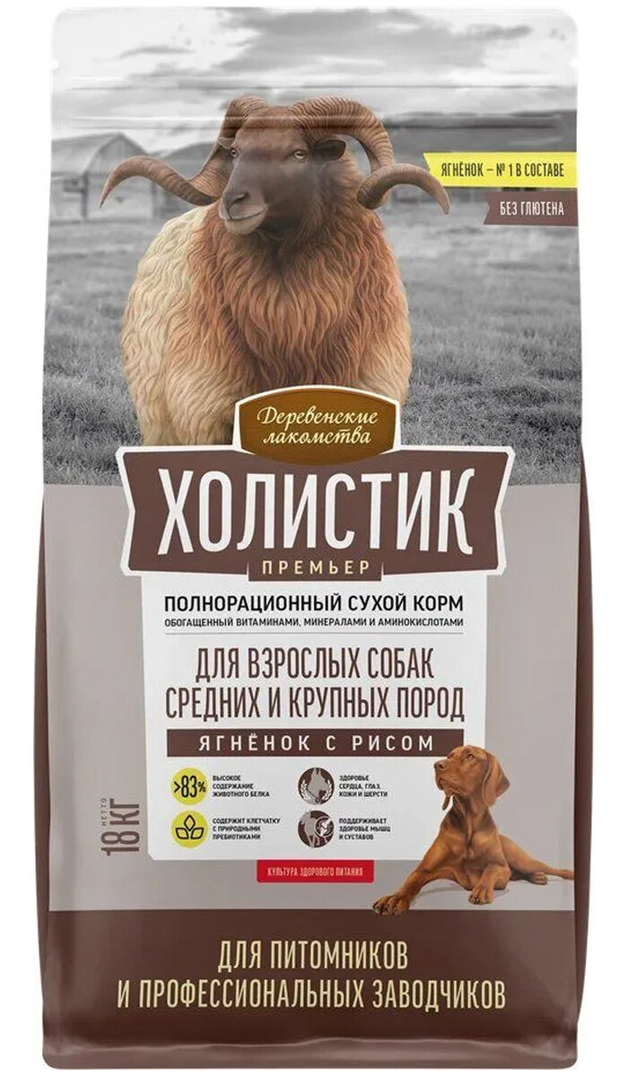 Здоровье и долголетие являются основными приоритетами в рецептурах кормов «Холистик премьер». Именно поэтому основой наших кормов является настоящее мясо — источник высококачественного белка. Все рецепты обогащены глюкозамином и хондроитином — для здоровья костей и суставов; омега-жирными кислотами и пребиотическими волокнами — для поддержки желудочно-кишечного тракта, крепкой иммунной системы и идеального состояния кожи и шерсти. Состав: Дегидрированное мясо ягненка 35 %, рис, куриный жир, горох, дегидрированная говядина 7 %, сушёный батат, говяжий жир, тапиоковый крахмал, свежая утка 1 %, сушёные пивные дрожжи (источник пребиотика MOS), витаминно-минеральный комплекс (А, D3, E, B1, B2, B6, B12, ниацин (B3), холина хлорид, железо, медь, марганец, цинк, хлорид калия, глюкозамин, хондроитин, L-лизин), гидролизат куриной печени, сушёные яблоки, сушёная груша, сушёная тыква, сельдерей, сушёный цикорий (источник инулина и пребиотика FOS), мука орхидеи, семена подорожника, ягоды годжи, масло лосося, сушёные морские водоросли.