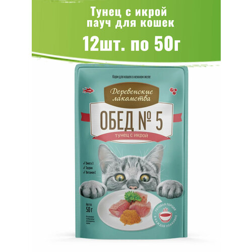 Влажный корм для кошек "Деревенские лакомства" Рыбный обед №5 из тунца с икрой в нежном желе, пауч (50гр х 12шт)