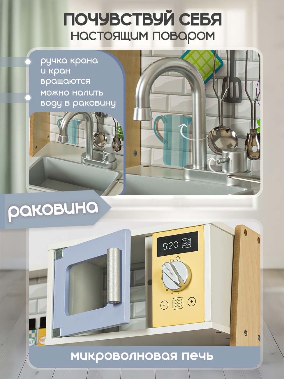 • Экологичные материалы: кухня детская деревянная выполнена из высококачественного МДФ, что обеспечивает безопасность и долговечность. Все детали гладкие, без острых углов.