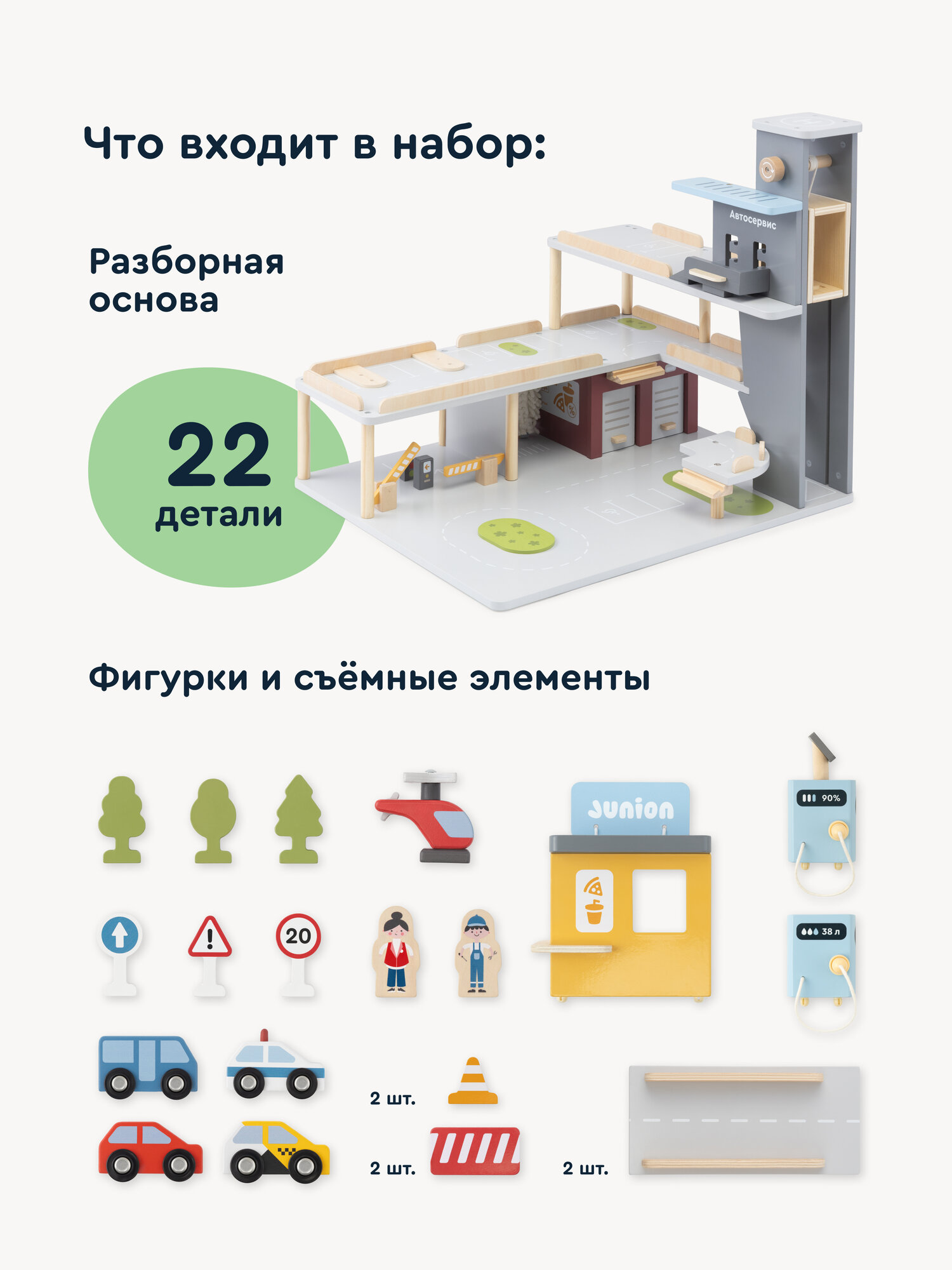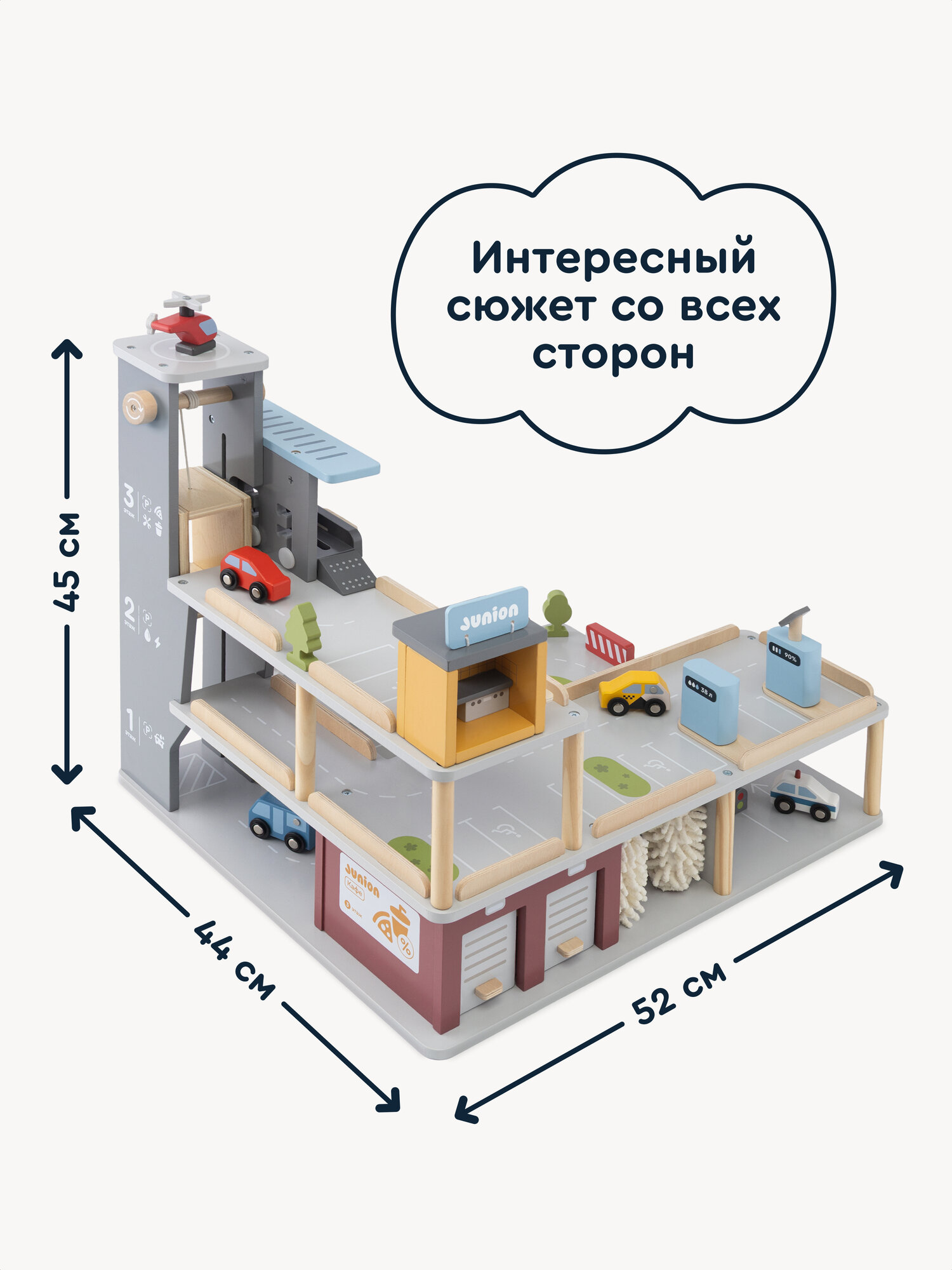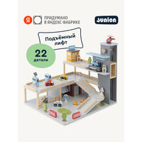 «Автостанция Паркинг-Драйв в Junion» — это деревянная парковка для машинок, придуманная в Яндекс Фабрике настоящими родителями. Такая игрушечная парковка с краном и автомойкой подойдёт детям от 3 лет. На трёх этажах игрового набора ребёнок сможет придумать целый город. На первом этаже — гаражи, которые открываются с двух сторон, и автомойка с крутящимися щётками. На втором — заправка на магнитах, а на третьем — автокафе. Между уровнями ездит подъёмный лифт для машинок со стопером, чтобы транспорт не скатывался. Фигурки человечков дополняют городскую среду, чтобы ребёнок мог разыгрывать свои истории и знакомиться с правилами дорожного движения. В набор также входят машинки, вертолёт, парковочные элементы и дорожные знаки. Все детали сделаны из экологичных материалов, аккуратно отшлифованы и покрыты безопасной краской — их приятно держать в руках. Трек-парковка развивает воображение и мелкую моторику. Она совместима с другими игрушками Junion, поэтому можно расширять город новыми маршрутами и игровыми зонами.