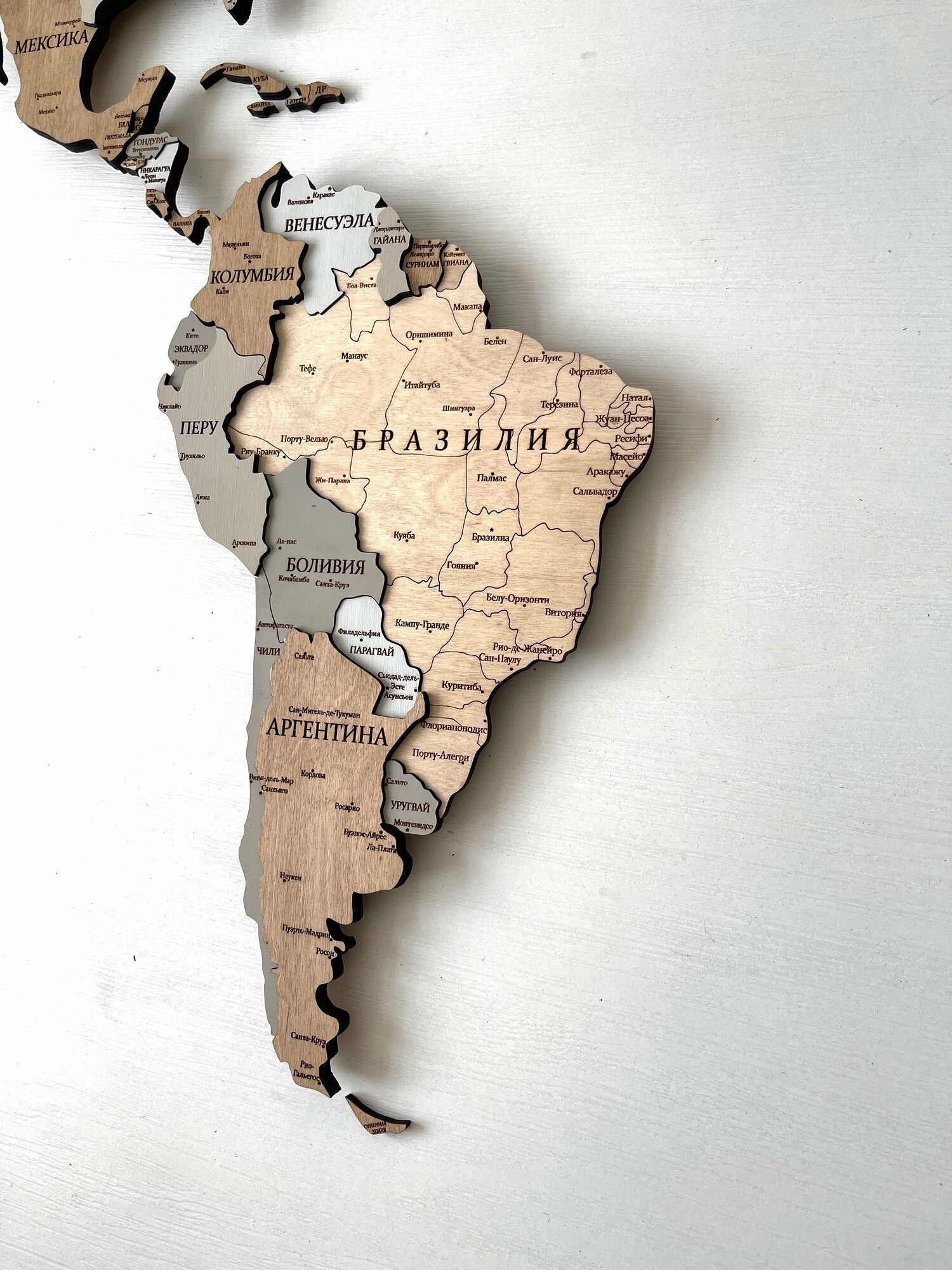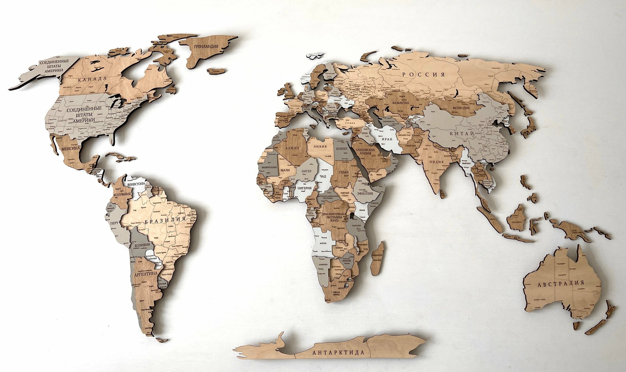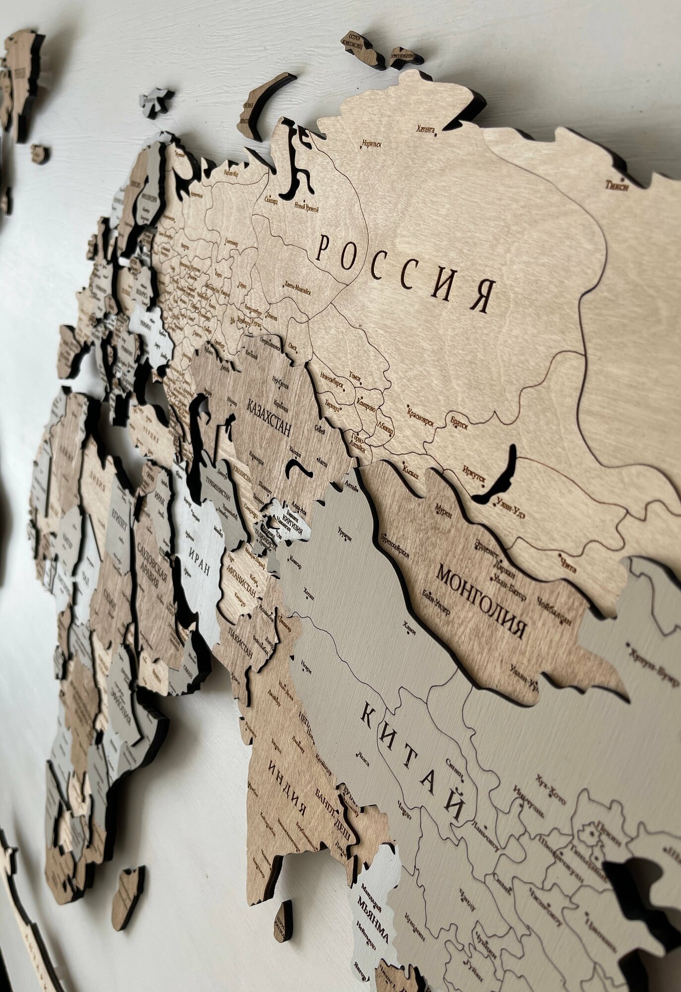 Купить Деревянная карта мира 3D многоуровневая 140/80 см в цвете «Миндаль» на русском языке со столицами и крупными городами мира, подробная/ картина из дерева на стену с доставкой по всей России.