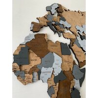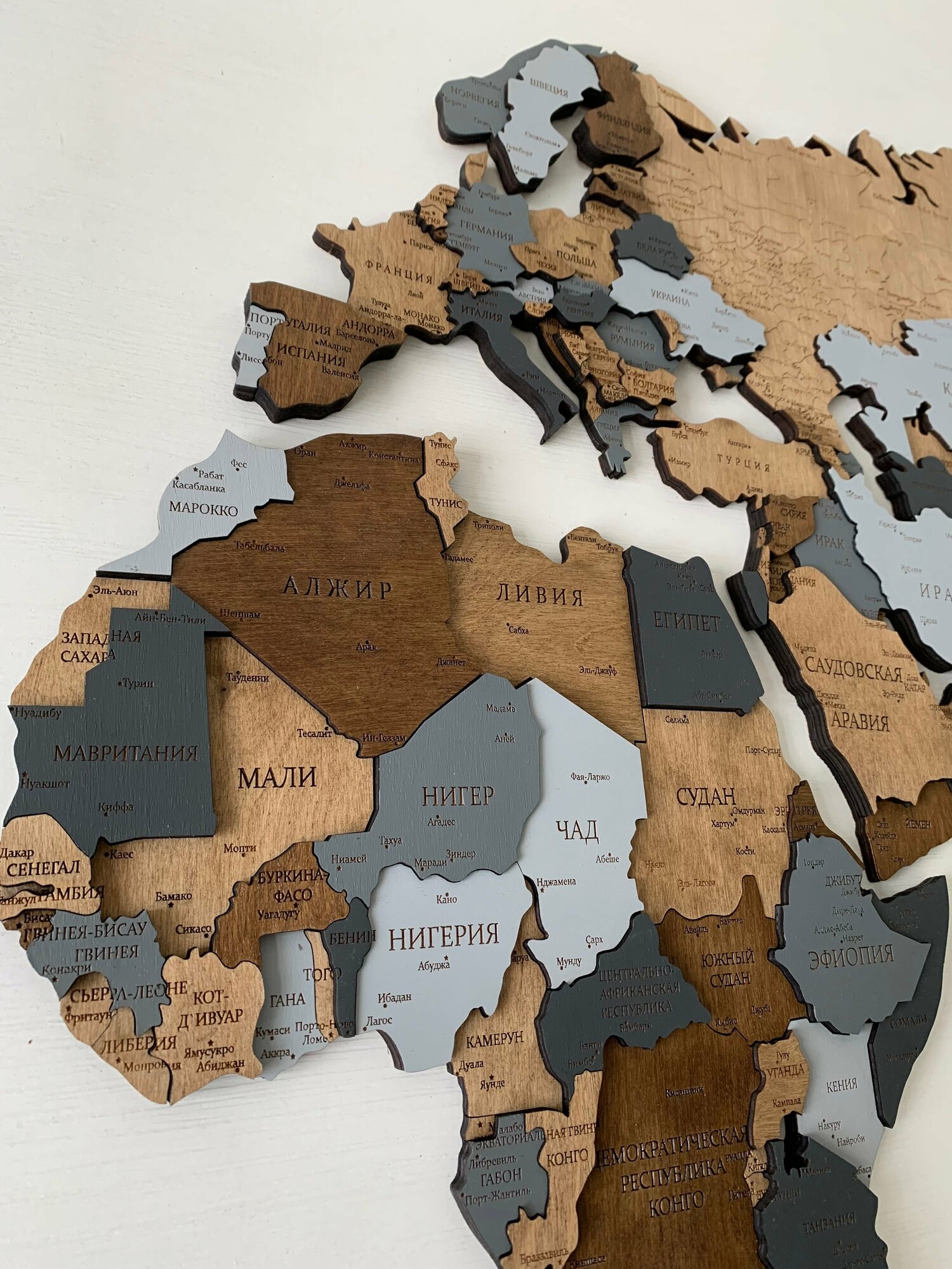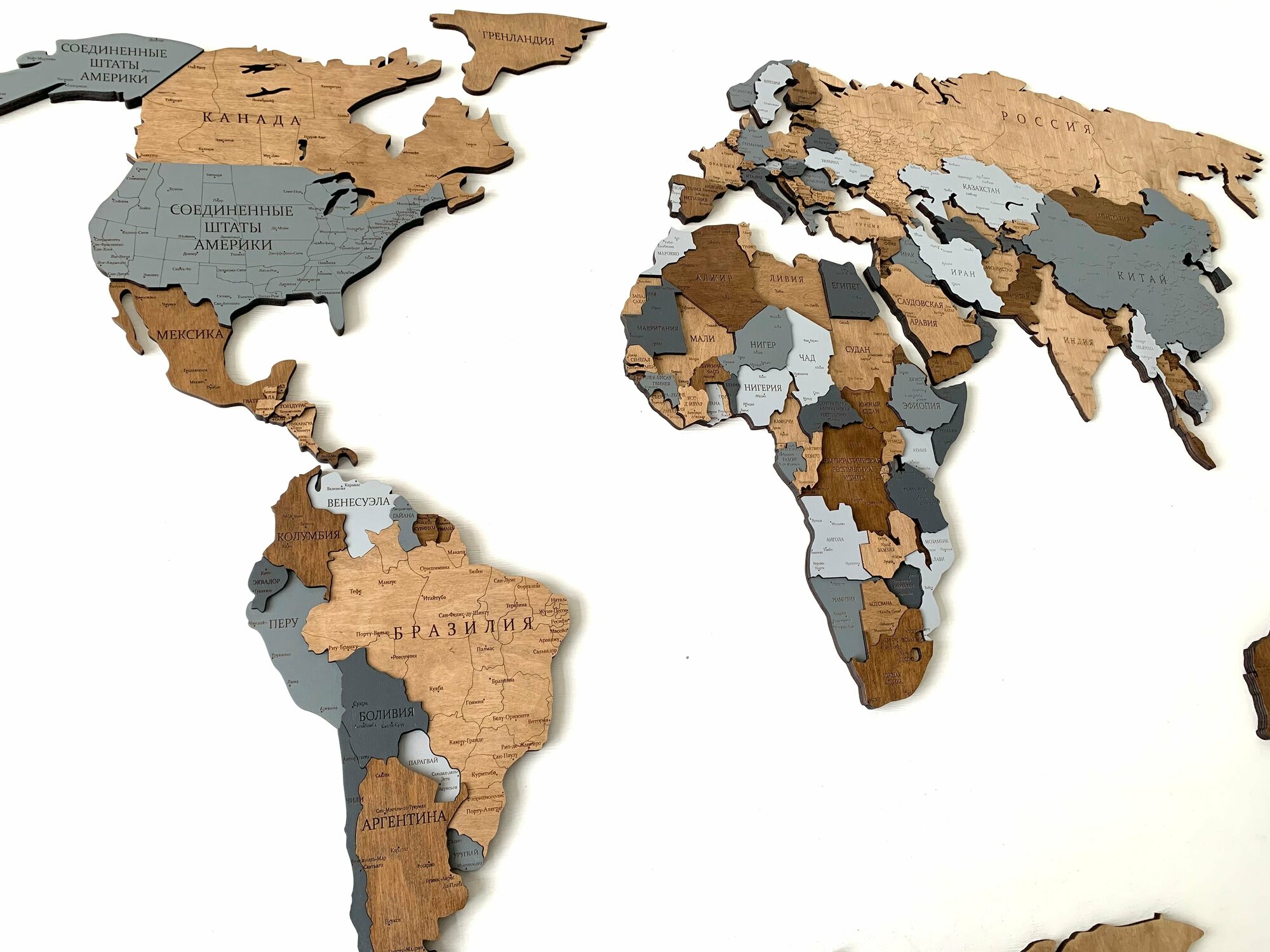 Деревянная карта мира 3D многоуровневая 200/115 см в цвете “Орех и серый» на русском языке со столицами и крупными городами мира, подробная/ картина из дерева на стену