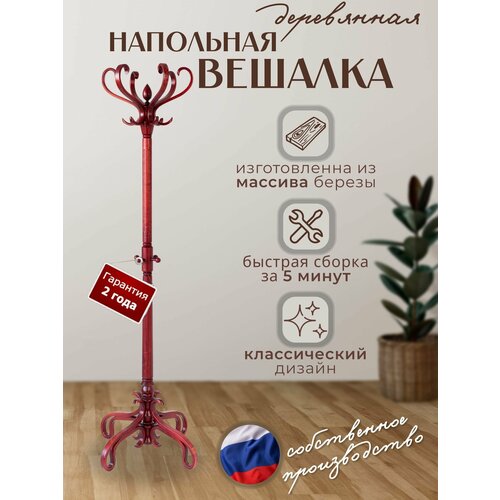 Вешалка оснащена пятью крючками для верхней одежды, пятью крючками для головных уборов и четырьмя крючками для зонтов и сумок. Крючки и опоры вешалки изготовлены по технологии гнуто-клееного шпона и выдерживают значительные нагрузки, что обеспечивает долгий срок службы вешалки. Покрытие напольных вешалок высокопрочный мебельный лак. За счет изгиба крючков, верхняя одежды не слетает с вешалки.