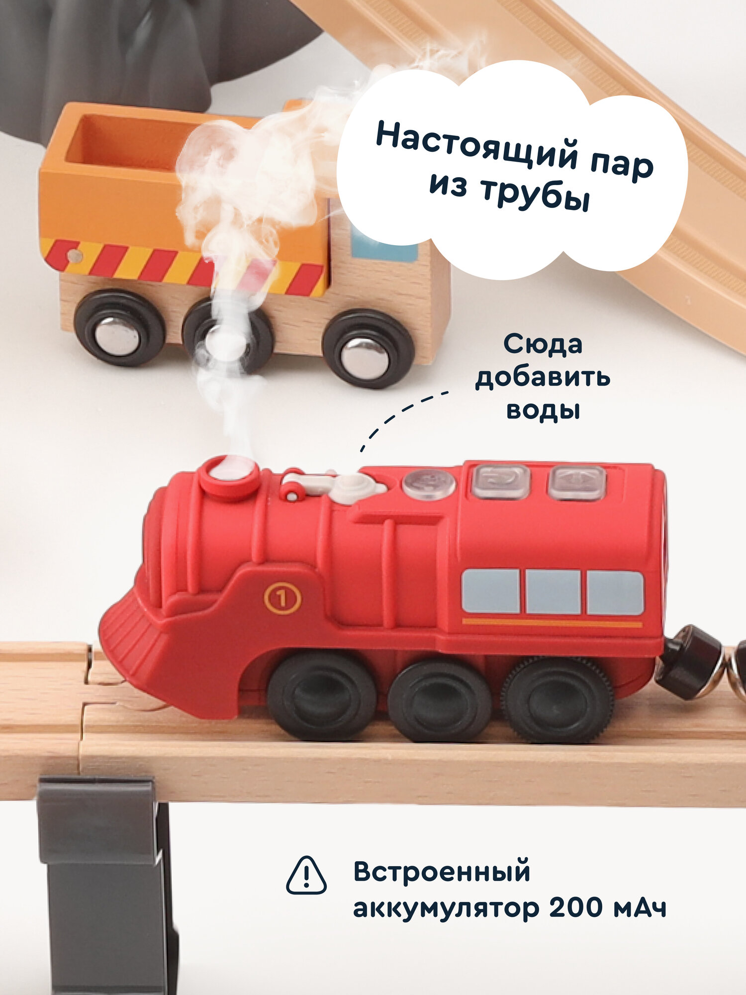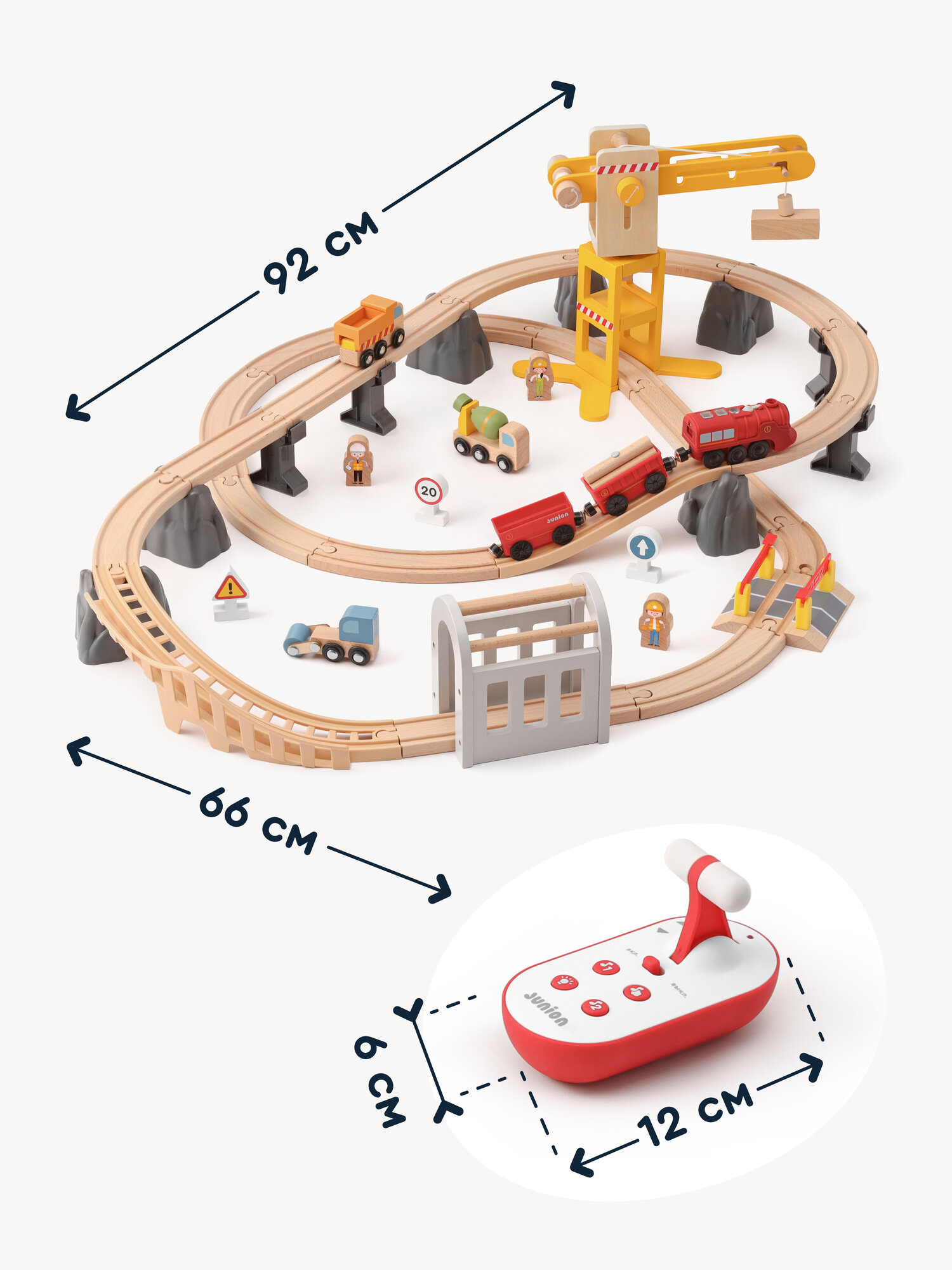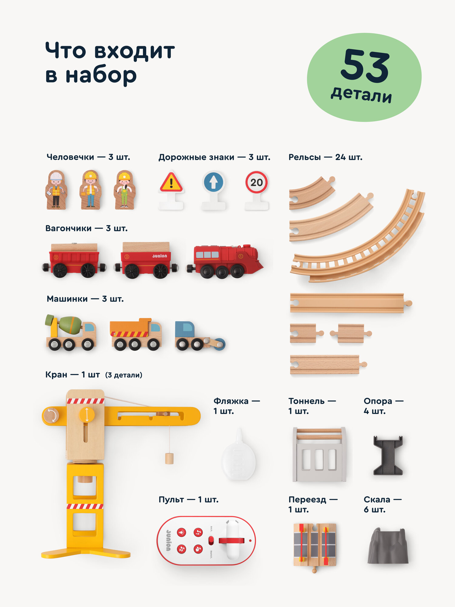Купить Деревянная железная дорога на радиоуправлении Junion Строительная история, 53 детали, электропоезд с паром с доставкой по всей России.