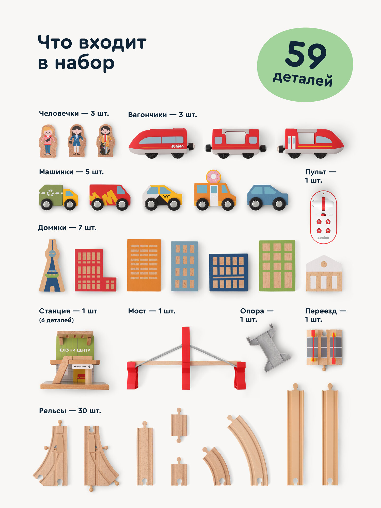 Деревянная железная дорога на радиоуправлении с электропоездом Junion Городское путешествие, 59 деталей: сравнение цен, характеристики, фото, актуальное наличие и цены.