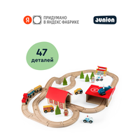 Железная дорога совместима с игрушками других брендов. Разные наборы из деревянной линейки Junion можно соединять между собой и построить целый город.