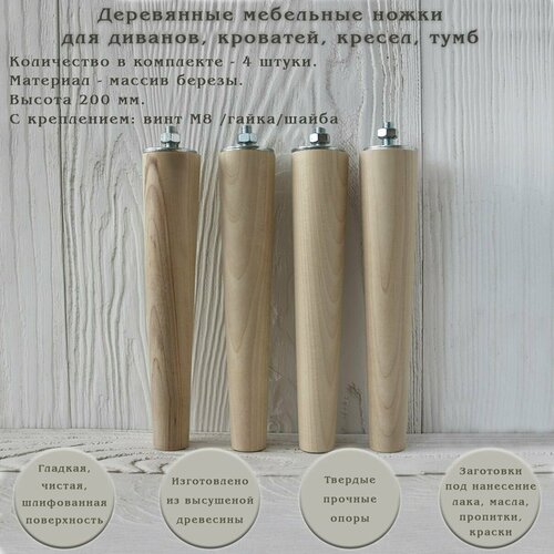 Деревянные ножки для мебели в форме конуса, высотой 200 мм предназначены для использования их в качестве опор при изготовлении диванов, кресел, тумб, пуфиков, банкеток, стеллажей, консолей.