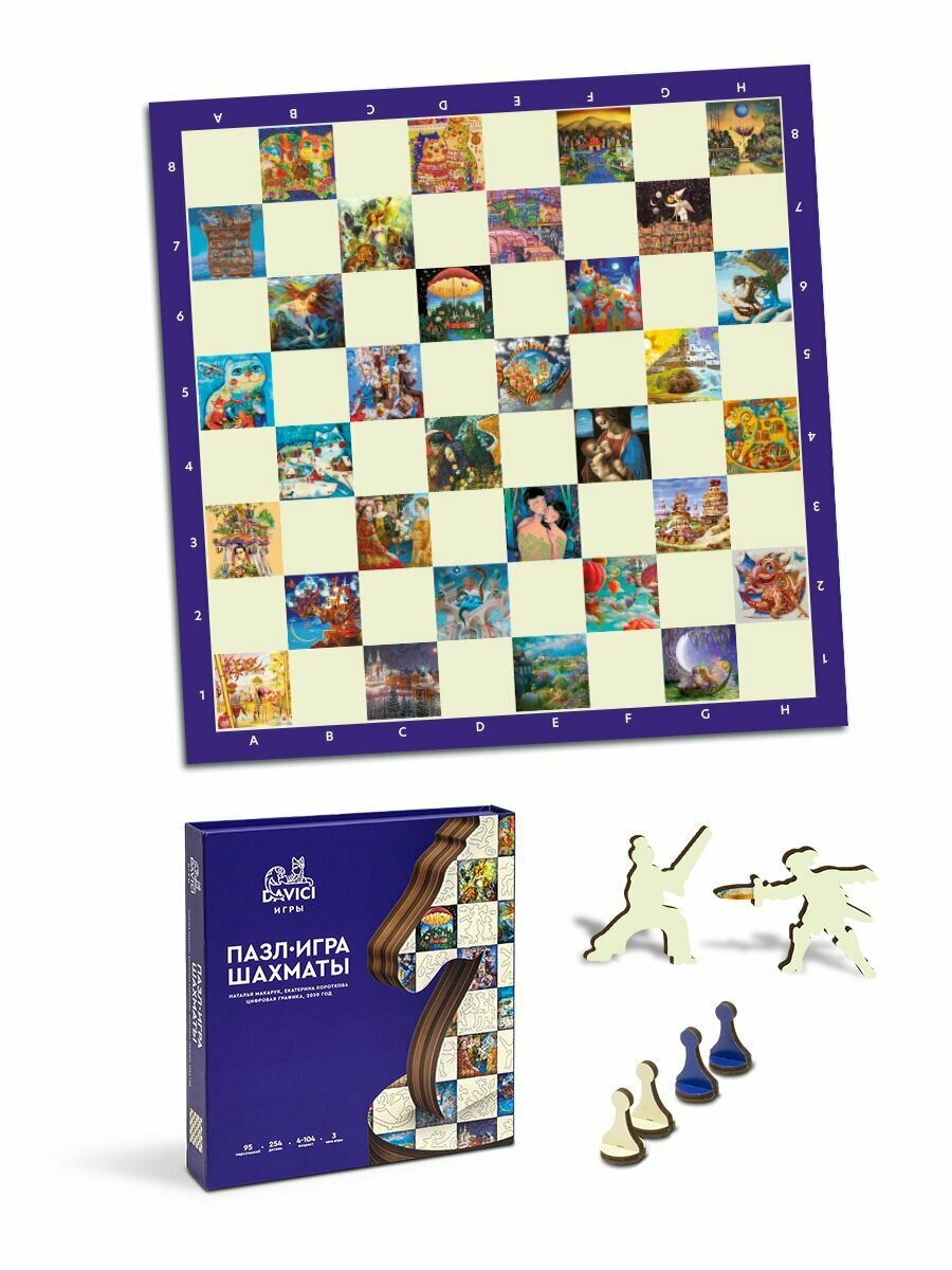 Подарочный набор включает 254 детали, из которых собираются шахматное поле с авторским рисунком и 32 шахматные фигуры (16 синих и 16 светлых). Размеры игрового поля после сборки 324x324 мм, высота фигур от 50 до 75 мм, клетка на поле 37х37 мм. Комплектация: 254 детали, клеевая для скрепления поля, клеевые пятачки для скрепления фигур. Размер упаковочной коробки позволяет хранить собранное шахматное поле. Специальный ложемент в коробке фиксирует каждую шахматную фигуру после сборки. 95 узнаваемых персонажей в деталях 24 картины DAVICI на одном поле