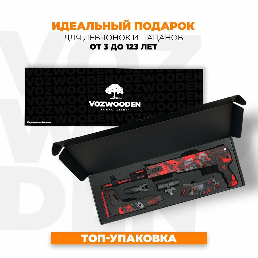 Автомат выполнен из качественного дерева, что делает его безопасным для детей. Игровой процесс с этой винтовкой помогает развивать навыки концентрации и координации движений. Детей привлекает уникальный дизайн, напоминающий скин из популярной игры Standoff 2.