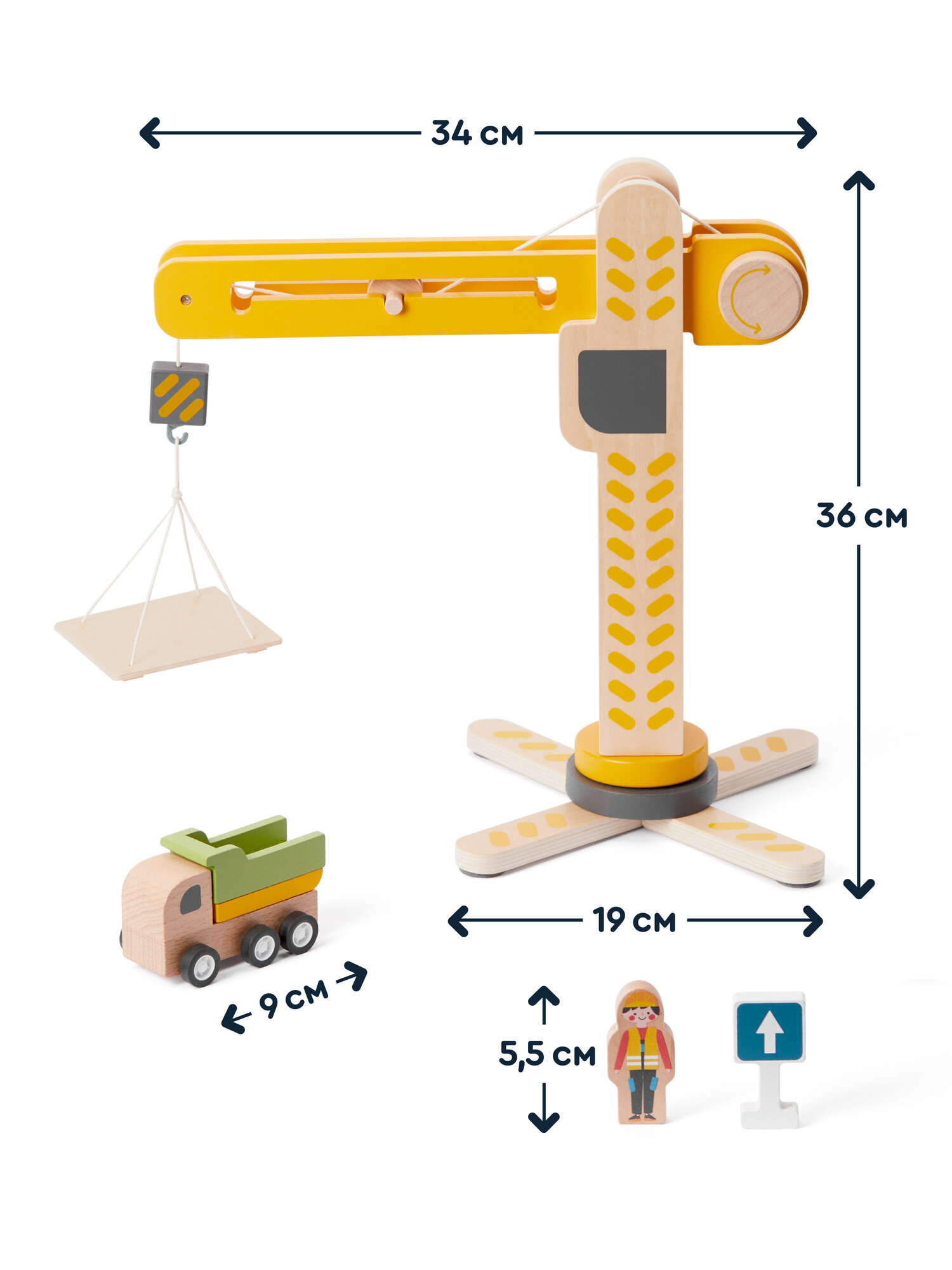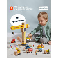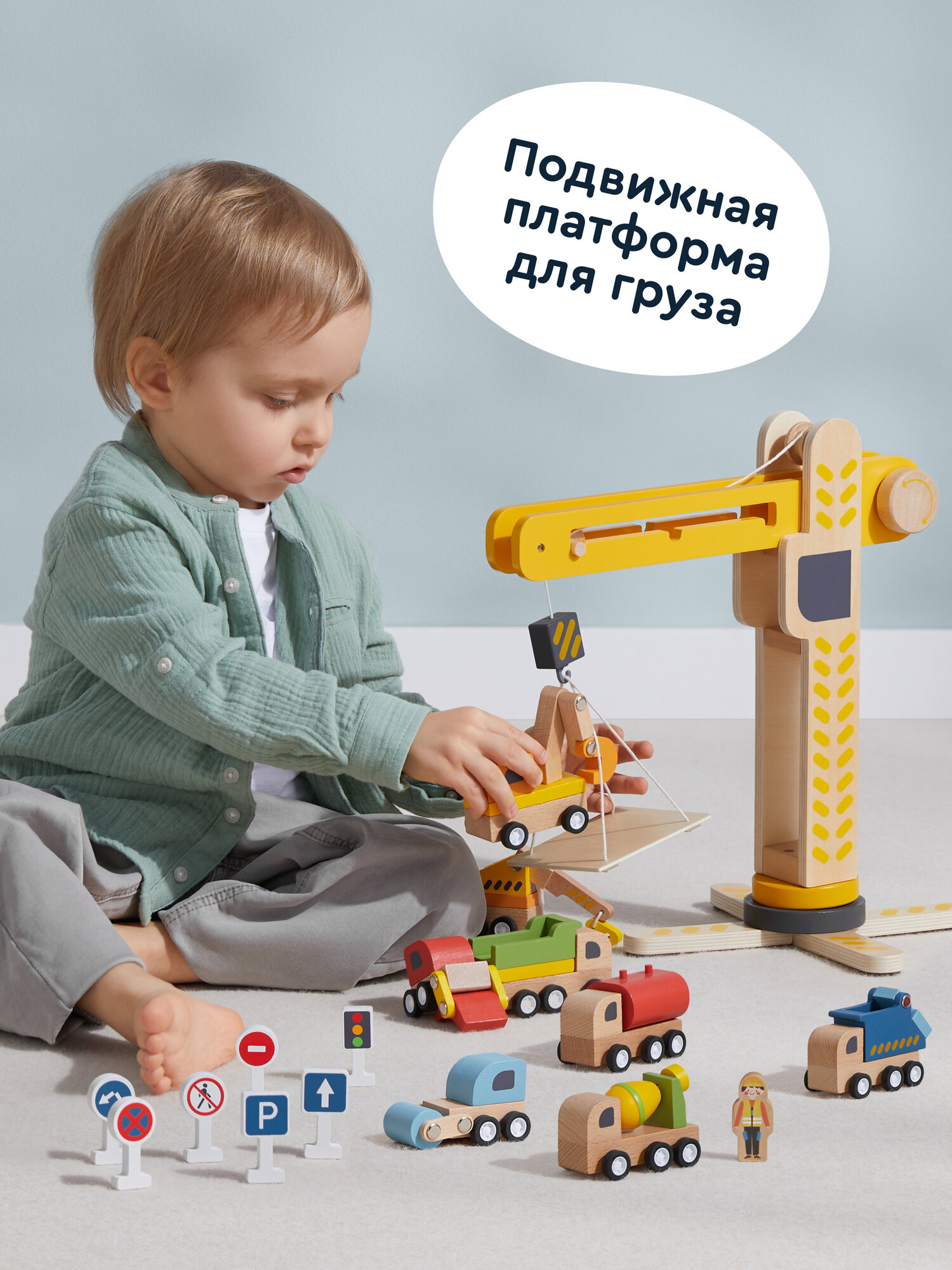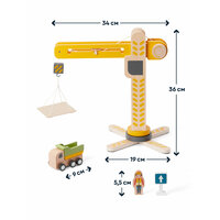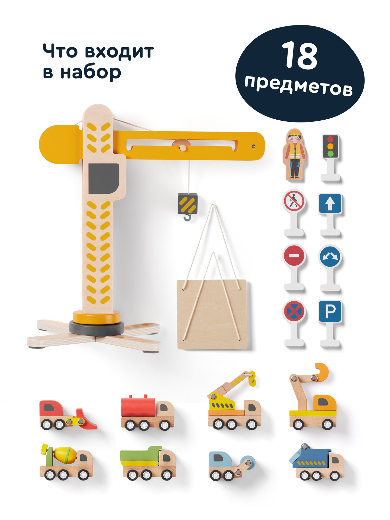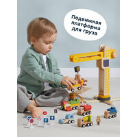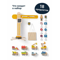 Деревянный игровой набор из 18 предметов: башенный кран с переносной платформой, 8 уникальных машинок, 7 дорожных знаков, фигурка строителя. Игрушечный кран двигается, а его башня поворачивается на 360 градусов. Можно строить свой маленький город, поднимать грузы и перемещать разные предметы как на настоящей стройке. У каждой машинки строительной техники, тоже есть подвижные детали: у самосвала поднимается кузов, у экскаватора — ковш, а мусоровоз сбрасывает груз.