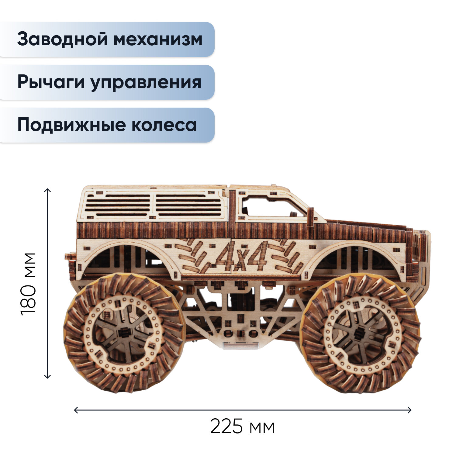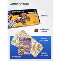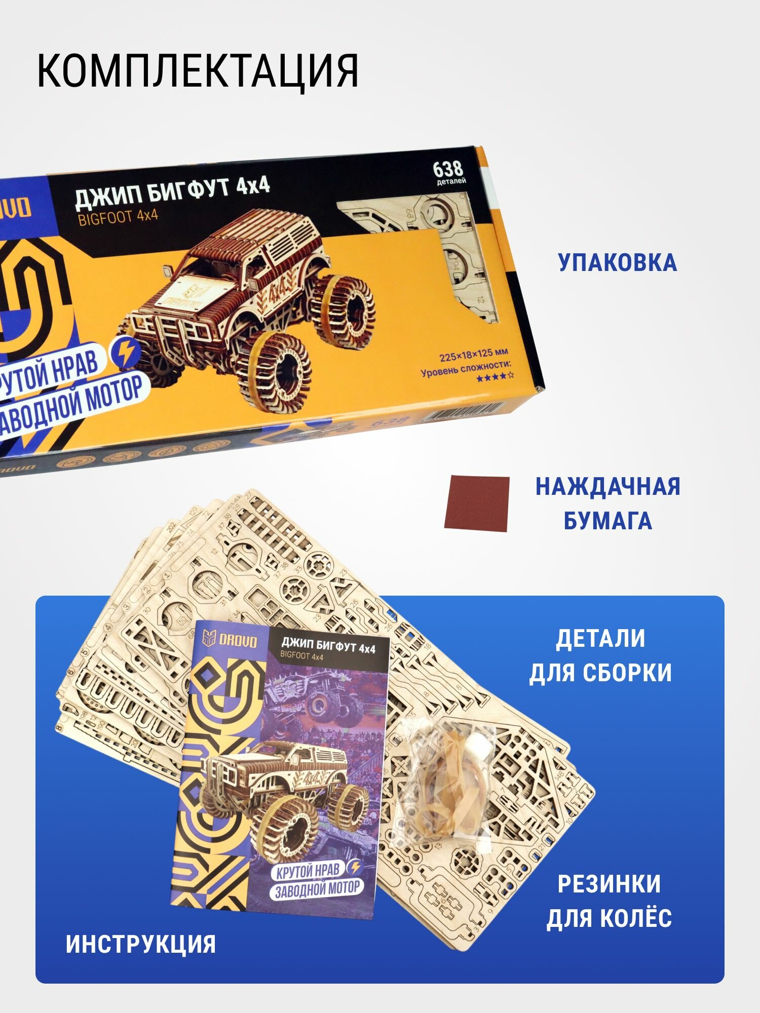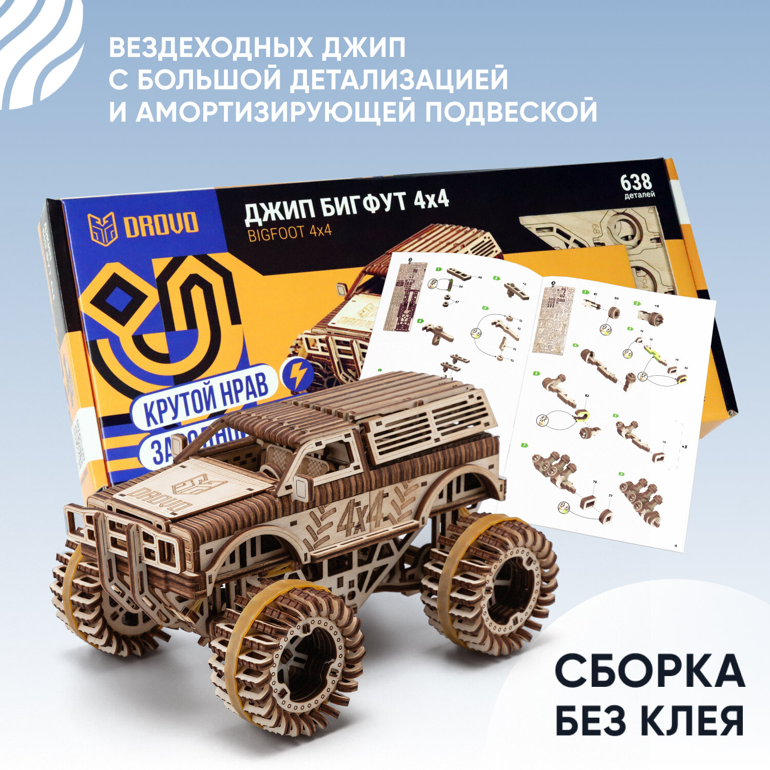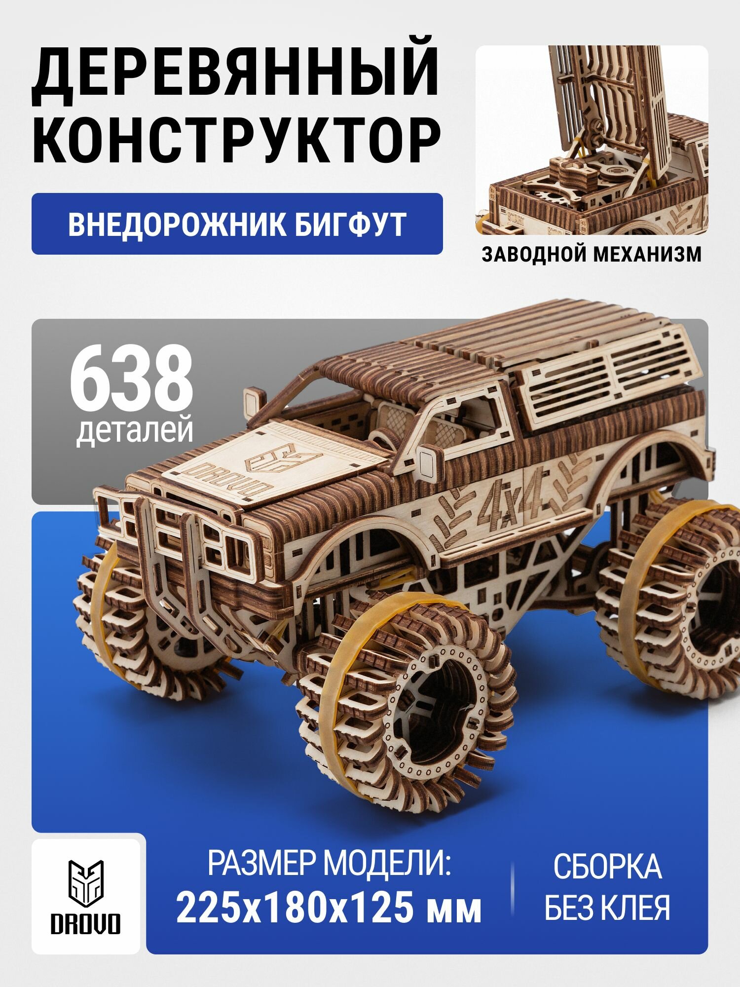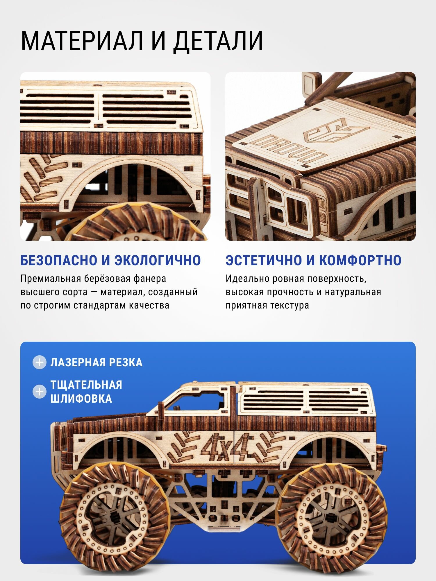 Этот конструктор DROVO — настоящий инженерный вызов и творческое удовольствие в одном. Он состоит из 638 деталей/ Модель внедорожника Джип БигФут 4×4 от Дрово с реалистичной подвеской. Есть и заводной механизм. Это одновременно и конструктор 3д, и продуманный деревянный конструктор : фигуры вырезаны лазером из берёзовой фанеры, что обеспечивает аккуратность и надёжность без клея. Сборка — это не простая пазловая задача, а настоящий танец механики: каждая деталь логично и легко вставляется в паз, образуя сложную сборная модель деревянная. Заводной механизм на металлической пружине добавляет драйва — модель может перемещаться самостоятельно, и именно это превращает сборку в подлинную конструктор техника.