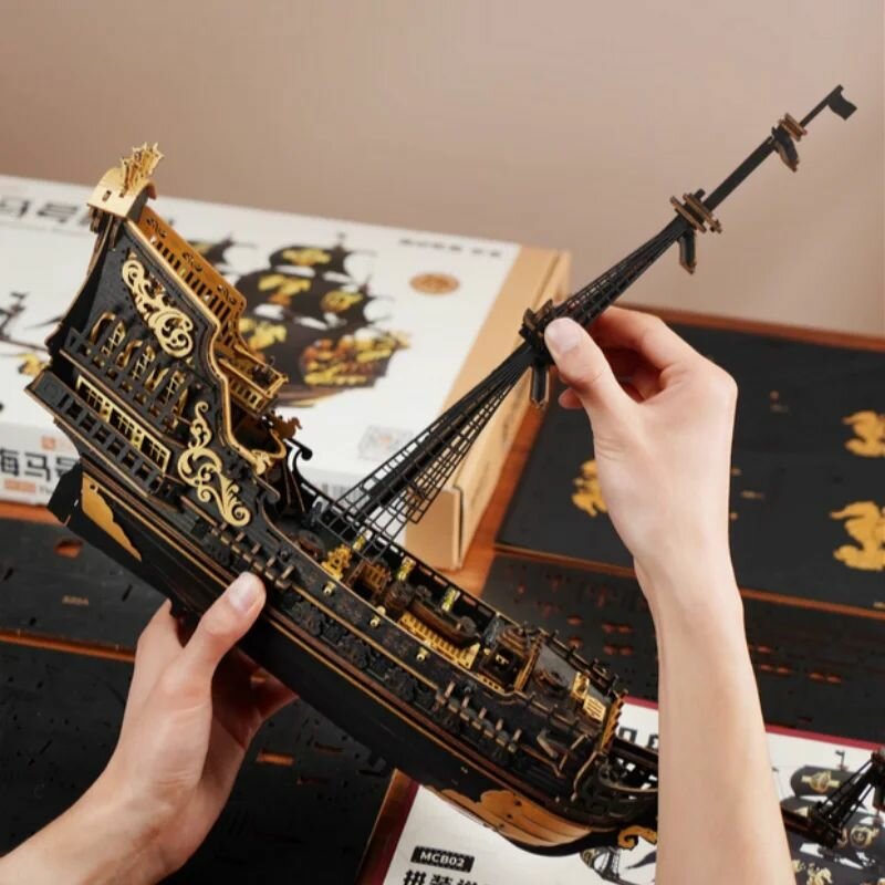 Деревянный конструктор корабль "Пиратский корабль " Морской конек" - это уникальный подарок для мужчин и женщин, которые любят увлекаться сборкой сложных моделей. Этот набор состоит из более чем 600 деталей, что позволит вам создать настоящий пиратский корабль с множеством деталей и функций.